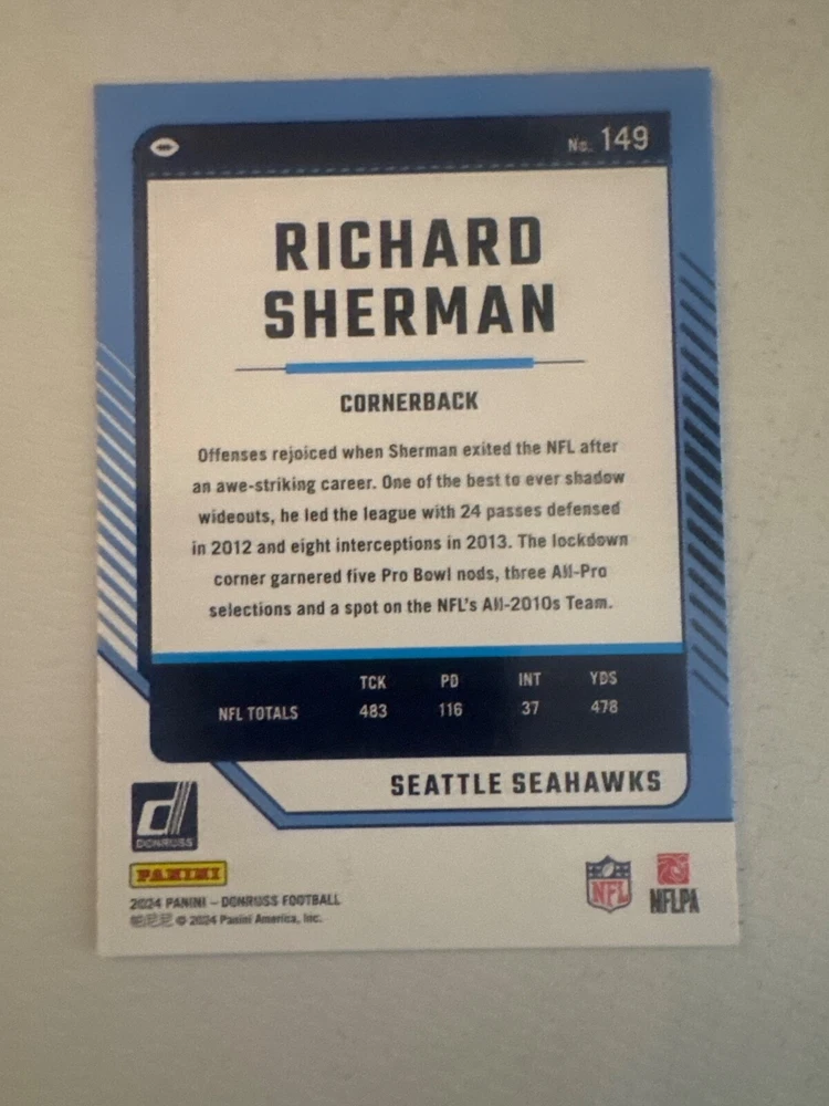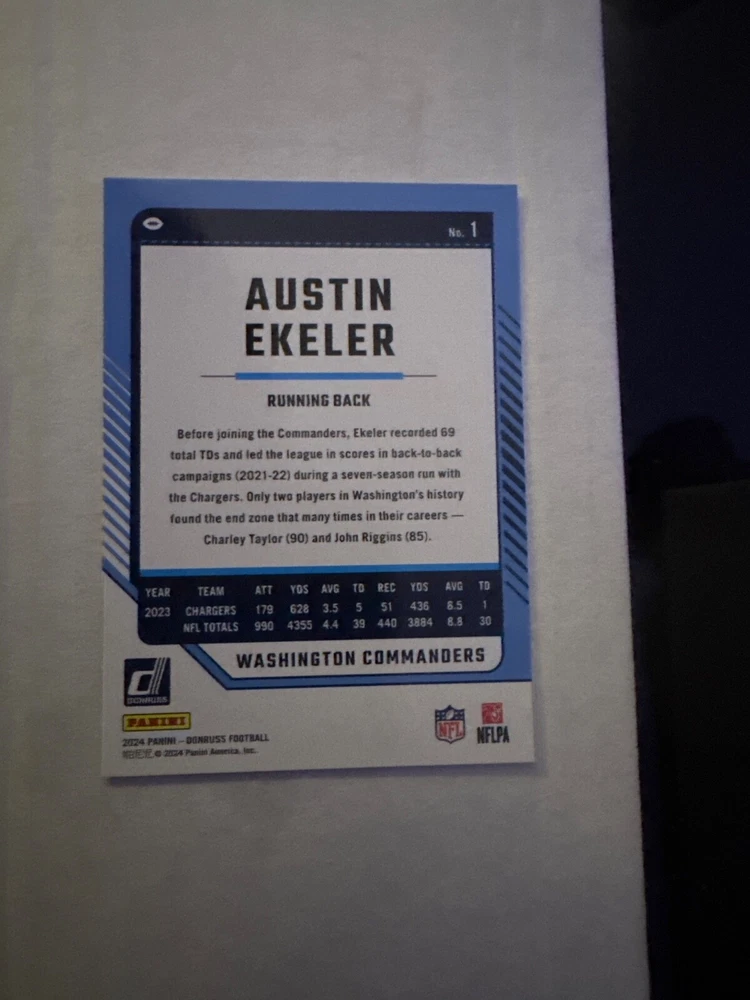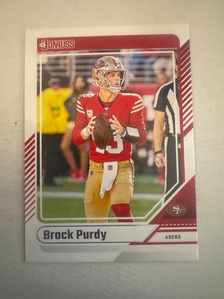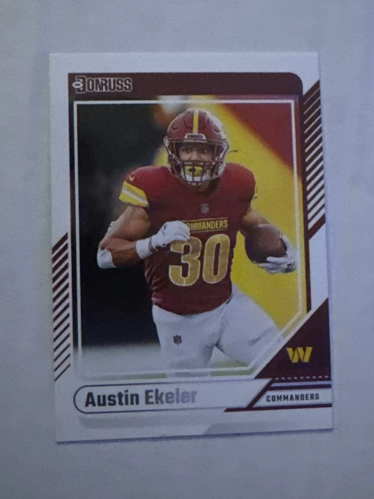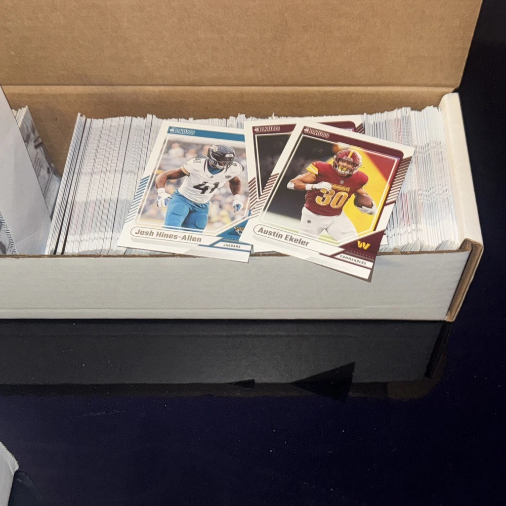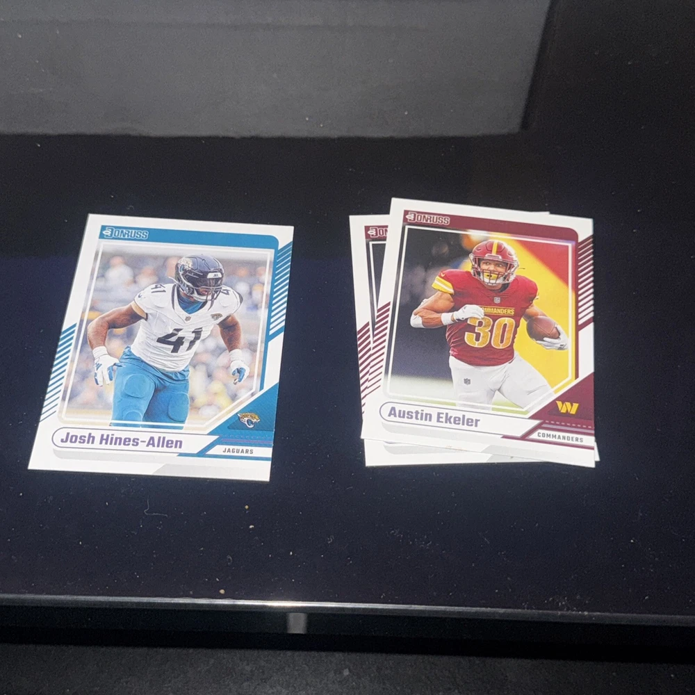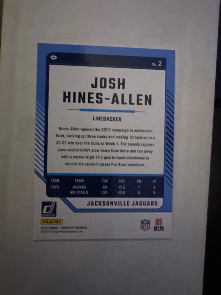 The product is a set of 2024 Panini Donruss Football trading cards, with card numbers ranging from 1 to 150. It is a part of the base set for the National Football League (NFL) season of 2024. The cards are made of card stock, in English language, and come from the United States. Each card is an original licensed reprint by Panini, and does not include autographs. You can either select individual cards to complete your set or choose a minimum of 2 cards for purchase.