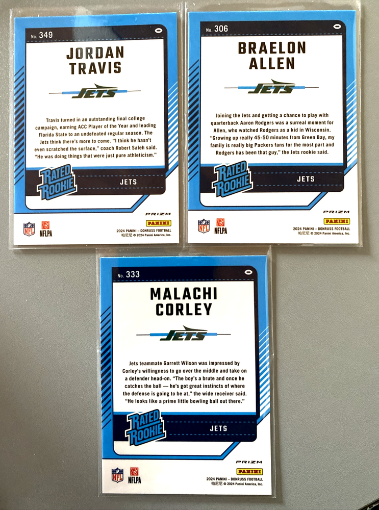 Elevate your sports card collection with the 2024 Donruss Optic Football Rated Rookie cards featuring the rising stars of the New York Jets. This set includes cards numbered 333, 349, and 306, showcasing Jordan Travis, Braelon Allen, and Malachi Corley in their rookie year. Each card reflects the quality and attention to detail that Panini is known for, with the Pink Optic feature adding a unique and desirable touch to these collectibles. As a fan of the National Football League (NFL), you'll appreciate the base set inclusion of these promising athletes, all within the same season. These cards are a testament to their potential and are perfect for any collector looking to commemorate the early careers of these football talents. Please note that while these cards are not autographed, they do stand out with their distinct Pink Optic finish.