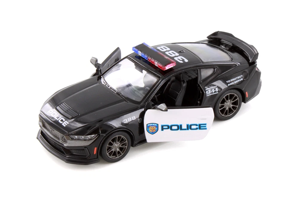 Get your hands on this detailed police car from Kinsmart! This 2024 Ford Mustang Dark Horse Police Edition is a 1/38 scale model replica. It comes in black and features pullback action and openable doors. It's a magnificent automobile for any police car collection, and just right for unwavering Ford fans! Features: 2024 Ford Mustang Dark Horse Police Edition - 5455DP Kinsmart Model Vehicle 1/38 Scale Collectible Model Police Car This is a 5"L x 2"W x 1.5"H Diecast Metal model with some plastic parts Pullback Action And Openable Doors Manufactured by Kinsmart - Police Edition Series