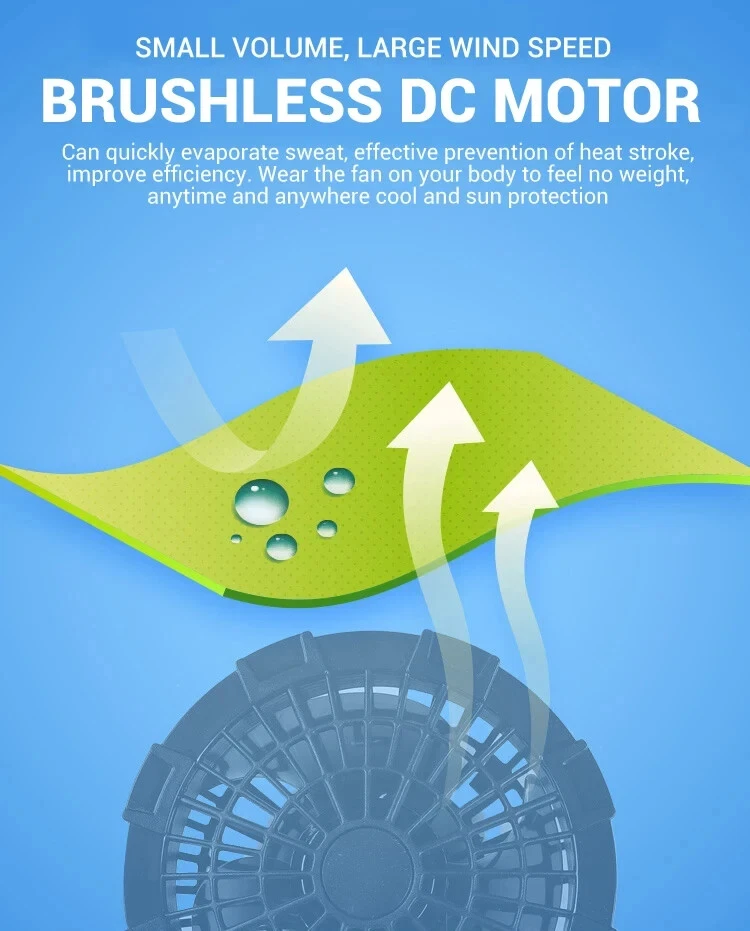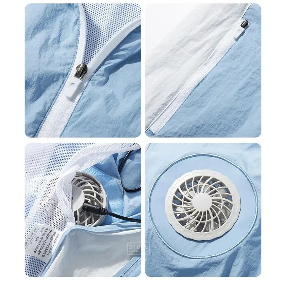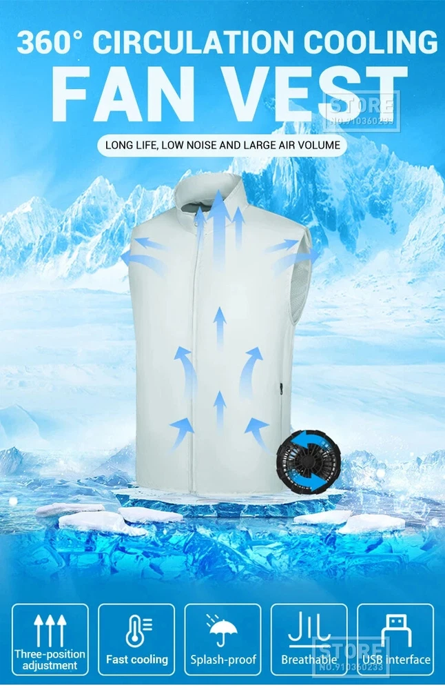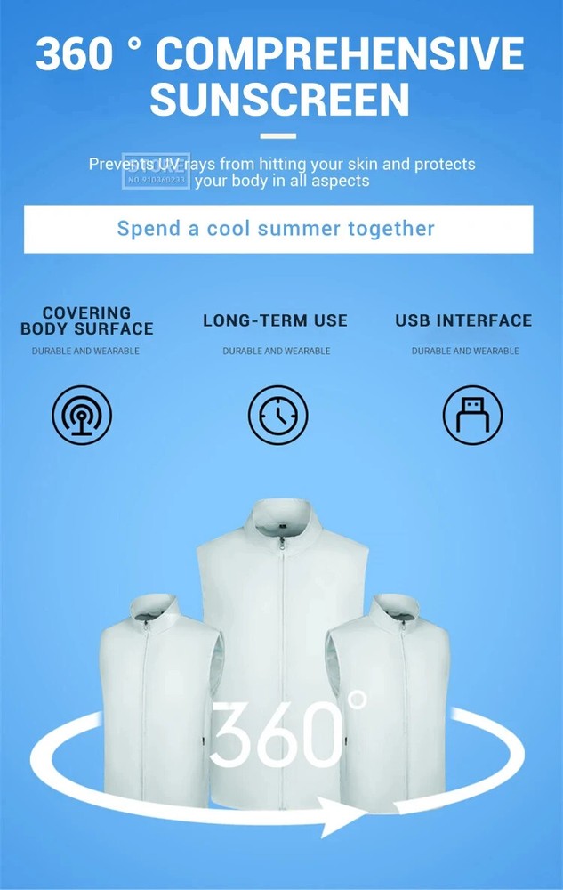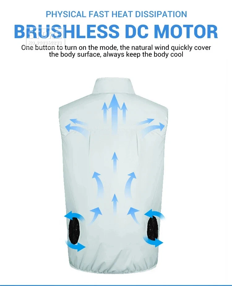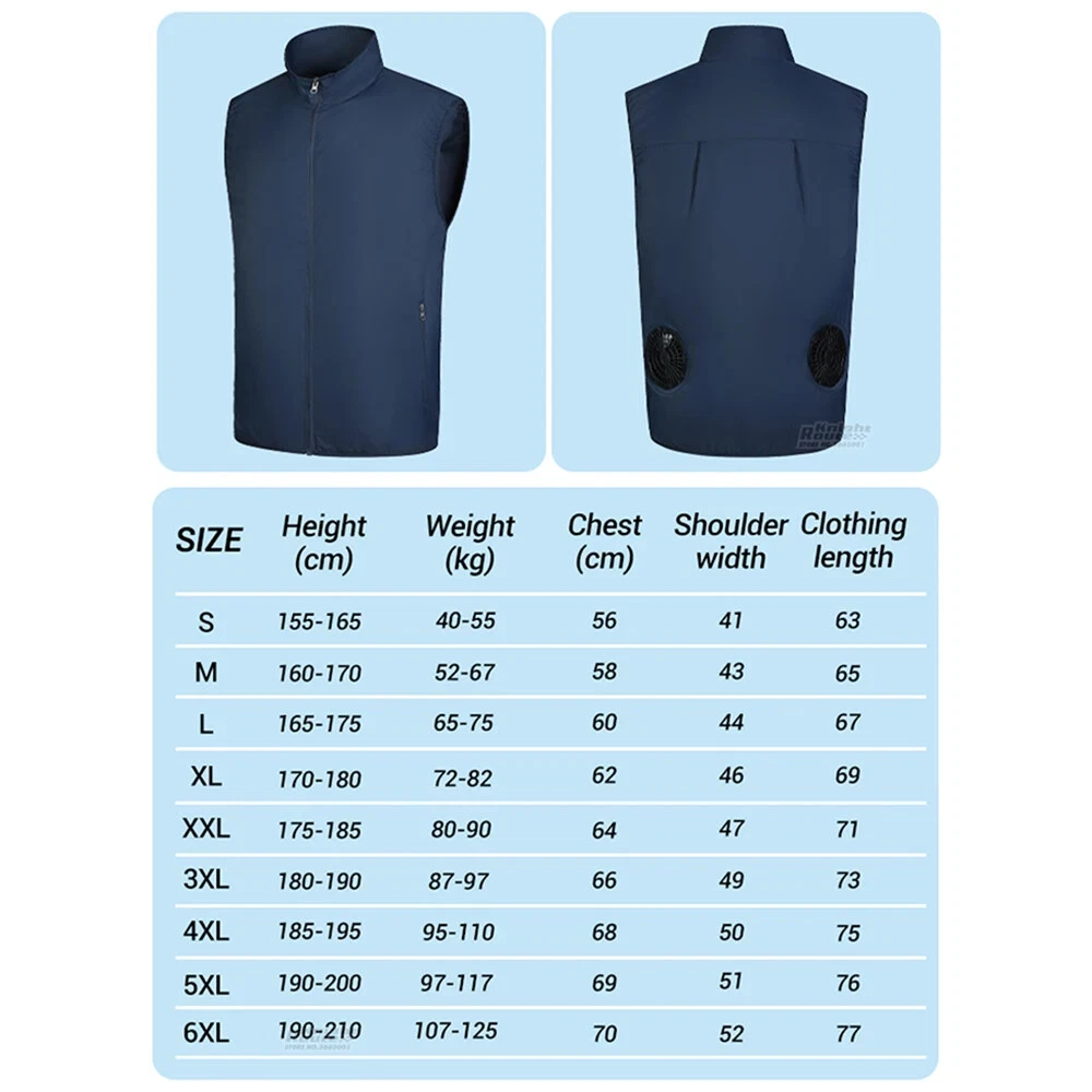 Specification: Name: Cooling fan vest Material: 100% polyester Gender: Men, Women Color: Blue, White Size:S,M, L, XL, XXL, 3XL,4XL,5XL,6XL Power source: Power Bank (NOT INCLUDED) Seasons: Spring and summer How does it work? The air is evenly distributed through the mesh to the whole body. The cool wind will lead the air to circulate within the vest, which will reduce the temperature by 20%. The inner mesh is sweat proof and breathable, and the fan will not come into direct contact with . It is more comfortable and safer to wear such a vest in summer. High-quality materials: The cooling vest is made of lightweight and breathable material, which can not only absorb sweat quickly, but also effectively block ultraviolet rays and prevent heat stroke. And the volume is not large, you do not have to worry about it will affect your work. It will increase your work efficiency. Dual fan design: The cooling fan vest has two fan units at the waist of the garment. Connect the power bank with USB and the clothes will start working. (Power bank not included) It has three airflow modes, so you can adjust the airflow according to the working conditions and reduce the temperature by more than 8°C For your intimate design: the waist is a place where the human body is easy to get cold. Therefore, there is a mesh layer on the waist of the inner layer of the garment. Not only can it prevent the wind from blowing directly to the waist and cause waist damage, it can also guide the wind to spread, quickly evaporate sweat, and take away the heat for you. Safe and easy to use: The cooling fan vest is easy to operate and safe. Machine washable, please don't forget to remove the fan assembly before cleaning. Suitable for many occasions: You can wear this cool clothes to work. Suitable for high temperature operations, such as construction sites, fields and high temperature areas; it is also ideal for sports such as hiking and mountain adventure. It can effectively block ultraviolet rays and can also be used as a windproof vest.