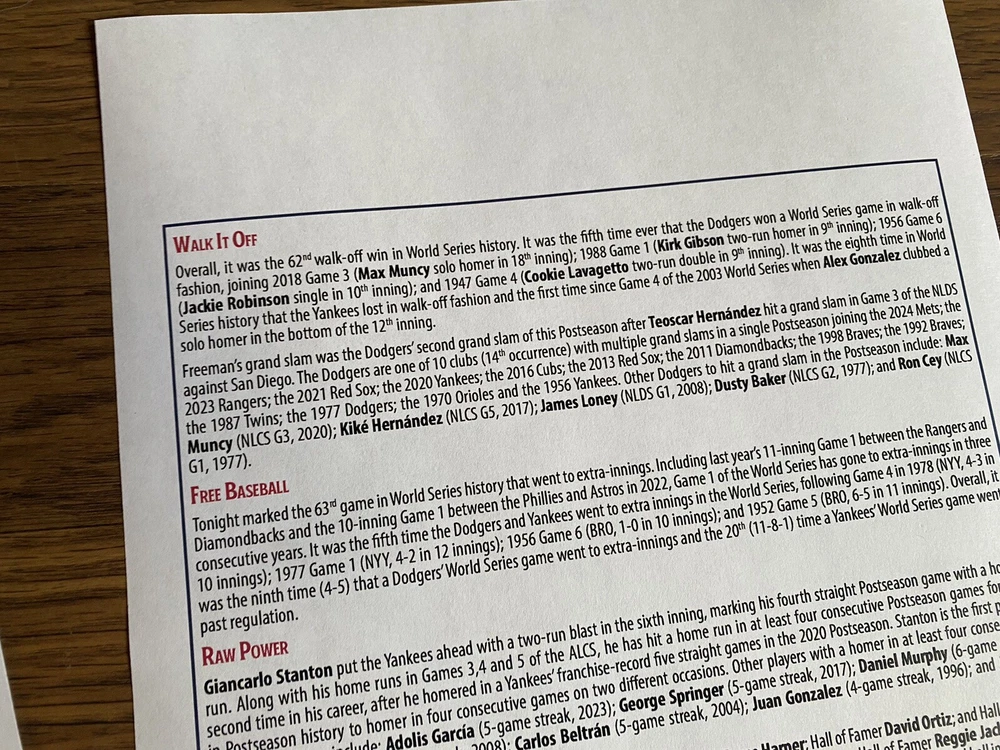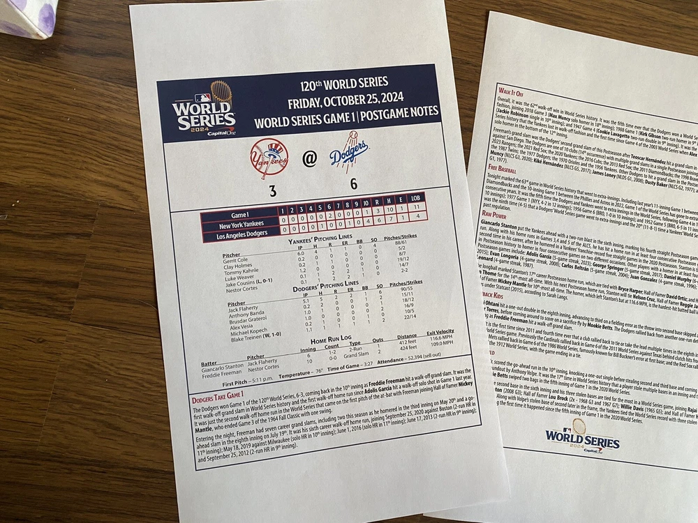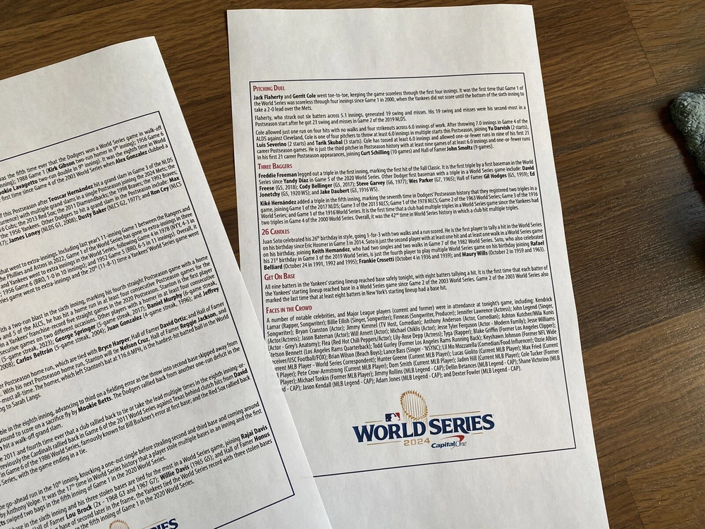Official MLB Media Issued Only Postgame Notes from the game. One of the greatest games of all time!!! Date: 10/25/2024 Pages: 3 Size: 8.5x14” media Teams: Yankees vs Dodgers