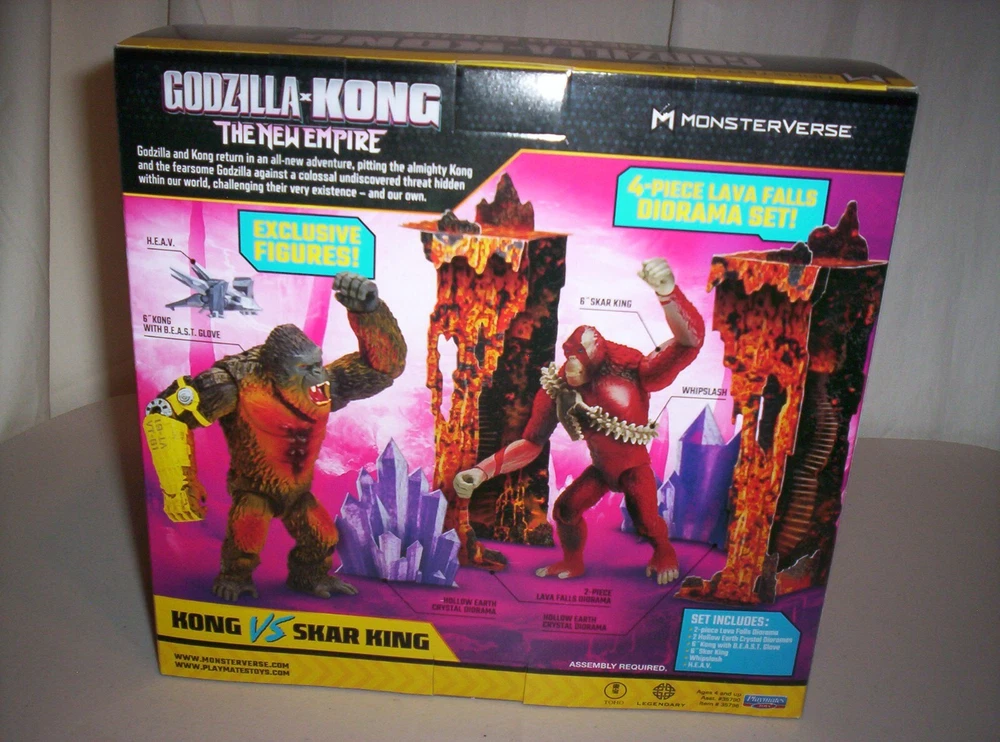 Get ready for an epic battle between the legendary Godzilla and the mighty Kong with this 4-piece diorama set from Playmates. Released in 2024, this set is perfect for fans of the Godzilla and Kong franchises, and is recommended for children aged 4 and up. The set features intricate details and high-quality construction, making it a great addition to any collection. With this set, you can recreate exciting scenes from the upcoming Godzilla x Kong movie, and is perfect for display in your home or office. Made in China, this set is sure to impress and is a must-have for any Godzilla or Kong fan. Order now and add this amazing piece to your collection! Set includes: 2-piece Lava Falls Diorama, 2 Hollow Earth Crystal Dioramas, 6" Kong with B.E.A.S.T. Glove, 6" Skar King, Whiplash, and H.E.A.V. Assembly required.