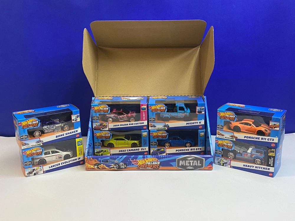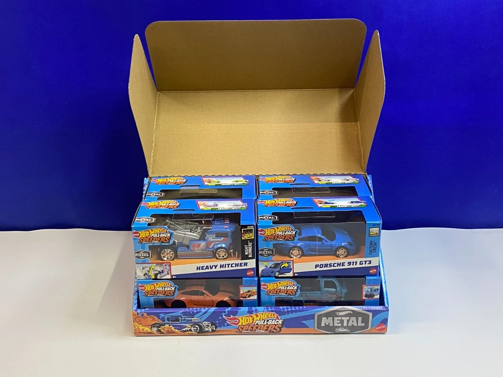 UP FOR YOUR CONSIDERATION IS A 2024 HOT WHEELS 1/43 SCALE CASE OF 8 PULL BACK SPEEDERS W/ STORE DISPLAY BOX. CARS INCLUDE: HEAVY HITCHER, PORSCHE 911 GT3 (BLUE), MIGHTY K, PORSCHE 911 GT3 (ORANGE), 2022 CAMARO ZL1, LANCER EVOLUTION IX, BONE SHAKER, 2004 MAZDA RX8 CUSTOM. ITEM IS NEW IN PACKAGE. CARS AND BOX LOOKS TO BE IN GOOD CONDITION. CHECKOUT PICTURES FOR FURTHER DESCRIPTION. THE ITEM IN THE PICTURES IS THE ITEM YOU WILL RECEIVE. ITEM WILL BE PACKAGED AND SHIPPED WITH CARE. THANKS FOR LOOKING.. I PACK ALL ORDERS WITH CARE AND SHIP THEM IN A TIMELY MANNER TO ENSURE SAFE ARRIVAL OF YOUR GOODS. IF SOMETHING ARRIVES AND IS NOT TO YOUR SATISFACTION, PLEASE LET ME KNOW AND I WILL MAKE IT RIGHT. FEEDBACK WILL BE GIVEN TO BUYERS, WHEN FEEDBACK IS GIVEN TO SELLER. THANK YOU FOR YOUR BUSINESS.