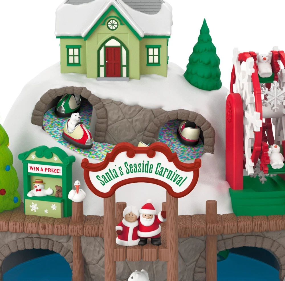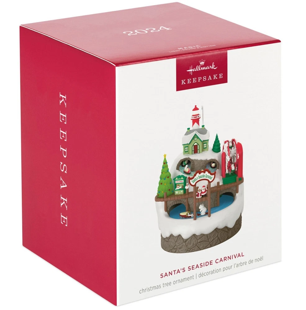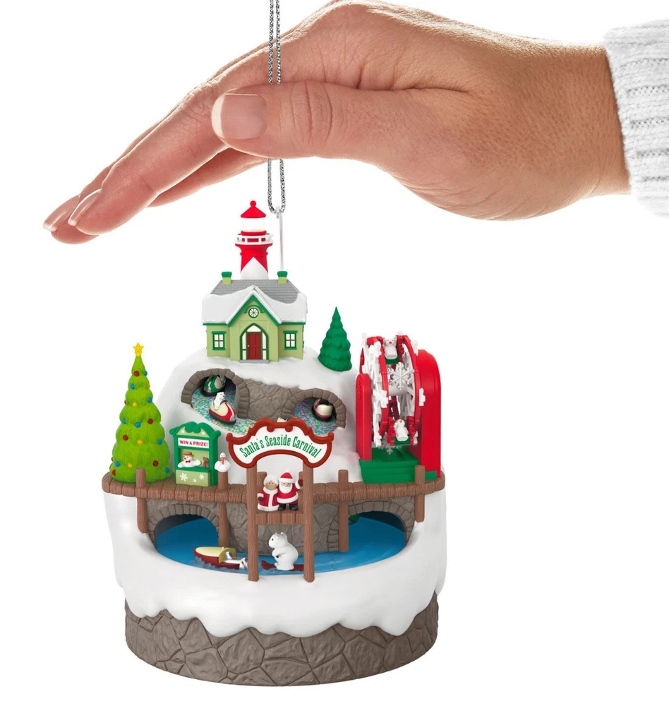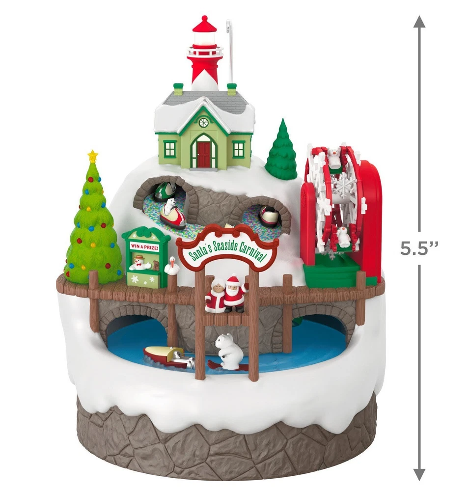 2024 Hallmark Santa’s Seaside Carnival Musical Ornament With Light and Motion Set sail for fun and festivities this holiday season with this charming Christmas tree ornament. Santa and Mrs. Claus welcome polar bear and snowmen friends to their Seaside Carnival set upon a snowy hillside with a lighthouse at the peak. Watch the carnival revelers get their thrills on bumper cars, water skis and a Ferris wheel as music from "I Saw Three Ships" plays. Battery operated. Key Features: Press the button on the Magic Sound, Light and Motion ornament to see it illuminate, watch the pieces move on the carnival rides, and hear music. Ornament plays music from "I Saw Three Ships." Additional Details: Artist-crafted by Tracy Larsen and Nello Williams. Plastic Christmas ornament features hanger attachment. Includes: One 2024 Keepsake Ornament in gift box for easy gift giving, preservation and storage. Requires three (3) AAA replaceable batteries (not included). Approx. Size in Inches: 4.42 x 5.5 x 4.46 RUSH SHIPPING AVAILABLE. Select your preferred shipping method at checkout. WE GLADLY OFFER COMBINED SHIPPING! Select "request combined shipping" at checkout to receive an invoice before making payment, or simply purchase any combination of items, pay the listed shipping charge, and send us a message requesting combined shipping. We will issue a refund to reflect your shipping discount. WELCOME TO BIG THUNDER TRADING, and thank you for viewing our listing! If you like what you see, consider following our store for more great products, great service, and great prices! CHECK OUT OUR OTHER LISTINGS for more great products!