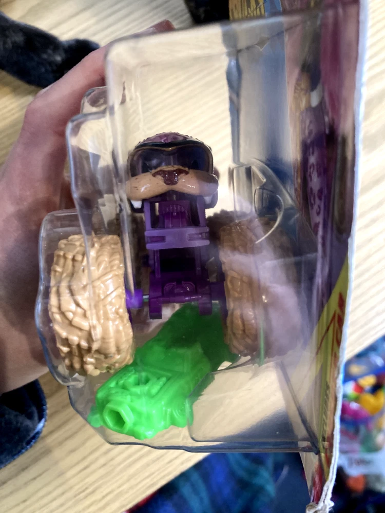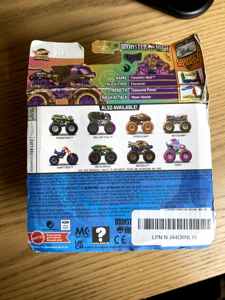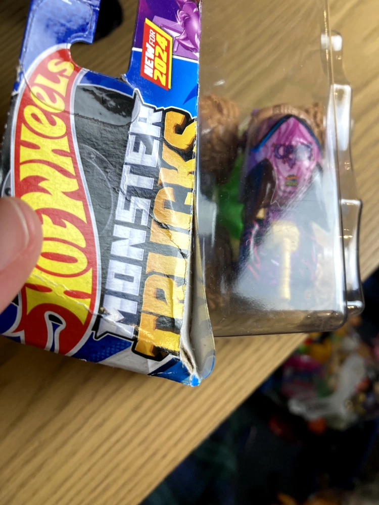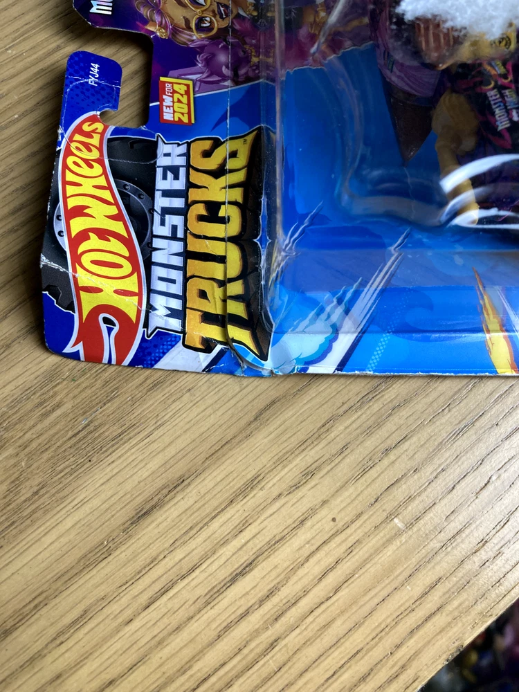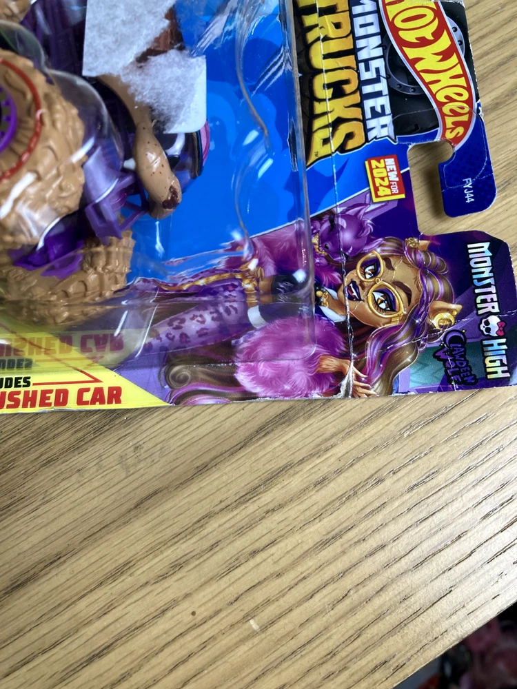 New Hot Wheels Monster High truck. Packaging has some damage, including minor separation of cardboard and residue from a sticker.