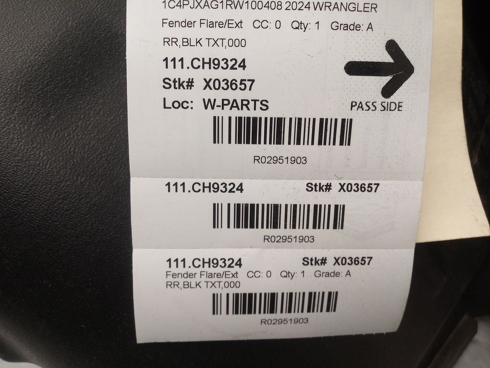 Store Home About Us Customer Resources Feedback Contact Us Passenger Right Rear Fender Flare For 2024 Wrangler 2951903 Free Shipping - 90 Day Warranty - Est. 1923 Description Elevate Your Vehicle's Style with a Premium Fender Flare or Extension! Schram Auto and Truck Parts - Fender Flare / Extension At Schram Auto and Truck Parts, Inc., we're dedicated to helping you make a statement with your vehicle's appearance. Our Fender Flare / Extension not only adds a touch of style, but it also represents an opportunity to repair or enhance your vehicle's personality. As an automotive recycling company committed to responsible practices, we salvage high-quality original equipment fender flares, ensuring these components continue to serve a purpose in helping others repair, restore, and elevate their vehicles. We understand that your vehicle's aesthetics matter. However, it's important to be aware that minor scuffs, scratches, and rock chips from normal use might be present on the fender flare. We don't guarantee the paint finish, so it's recommended to anticipate the need for repainting to achieve a perfect match with your vehicle. To ensure proper fitment, utilize the provided pictures, descriptions, and the 'Fitment Guide.' If you have any questions or uncertainties, we're here to assist you. Additional Information Please note that the fender flares are sold bare and do NOT include lights, mounting brackets, hardware, etc. If you need further clarification, don't hesitate to ask us for more details. Your Inquiries Are Important If you have any questions, uncertainties, or need more information, please reach out to us! Our dedicated team is here to provide you with the information you need for a confident decision. Elevate your vehicle's style with a premium Fender Flare or Fender Extension from Schram Auto and Truck Parts, Inc. Join us in supporting sustainable automotive solutions while adding a touch of personality to your vehicle. Vehicle 2024 WRANGLER Mileage 1000 Part Grade A What's this? Conditions RR,BLK TXT,000 Fitment Guide This item will fit the following vehicles / applications: R# 2951903 Stk# X03657 Holl# 111.CH9324 More Parts for 2024 WRANGLER » More Parts from this exact vehicle. » Accessories Brakes and suspension Cooling Systems Electrical and Lighting Engine and Drivetrain Exterior Parts & Sheet Metal Interior Parts Wheels and Tires Customer Service Payments Shipping International Returns FAQs Contact Us Quick Links Store Home About Us Feedback