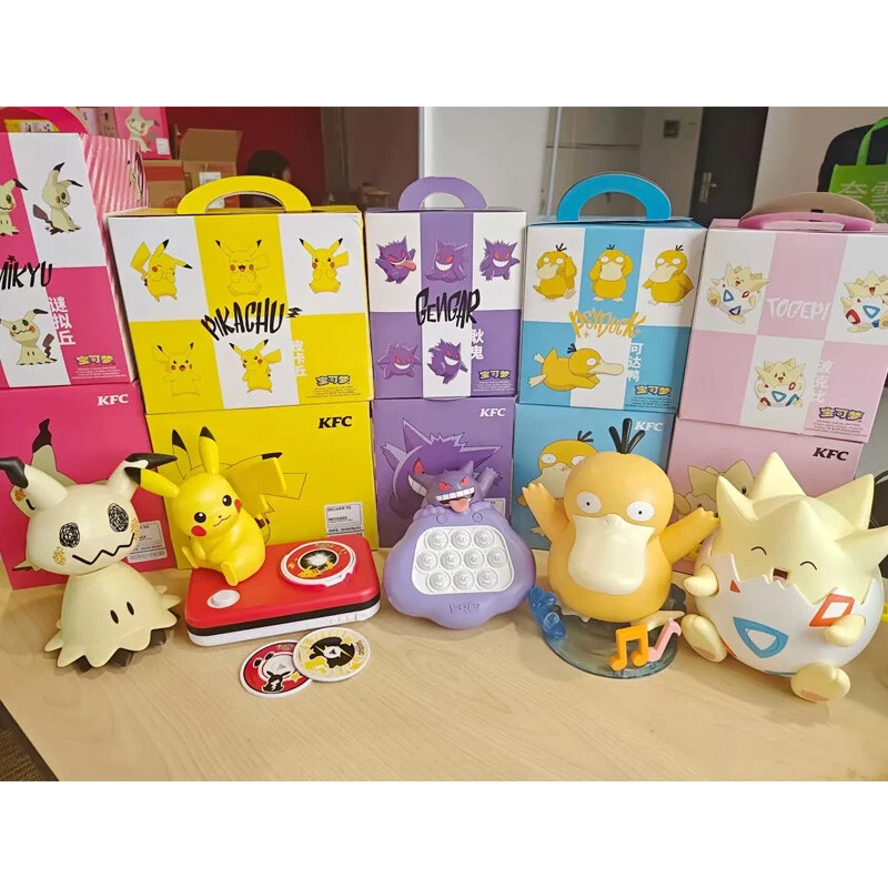 2024 KFC Children's Day Pokemon Characters Toy New In Box Pikachu Psyduck New In Box 1,pikachu---CD player have battery,3 pcs CD can change music,press the tail,can sing. box size:20*16.5*11cm 2,psyduck---music box have battery, touch two hands,will sing,touch the hair can change music. box size:13.5*14.5*16cm 3,gengar---game machine have battery,where light,touch it. box size:13.5*16*7cm 4,mimikyu---voice control toy have bettery,can move and sound box size:15*14.5*19.5cm 5,togepi---storage box have sticker,hand can swing box size:14.5*13.5*15.5cm