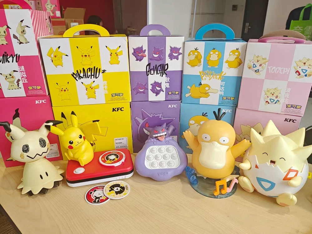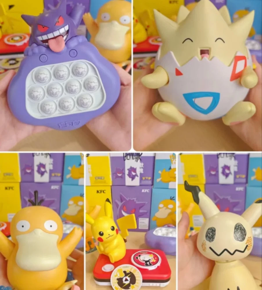 2024 KFC Children's Day Pokemon Characters Toys New In Box If you need 3 pcs or more,pleae contact me,I will give you a best price. 1, pikachu---CD player have battery,3 pcs CD can change music,press the tail,can sing. box size:20*16.5*11cm 2,psyduck---music box have battery, touch two hands,will sing,touch the hair can change music. box size:13.5*14.5*16cm 3,gengar---game machine have battery,where light,touch it. box size:13.5*16*7cm 4,mimikyu---voice control toy have bettery,can move and sound box size:15*14.5*19.5cm 5,togepi---storage box have sticker,hand can swing box size:14.5*13.5*15.5cm 6.1 Set Includes pikachu, psyduck, gengar, mimikyu, togepi (5pcs different Pokémon)