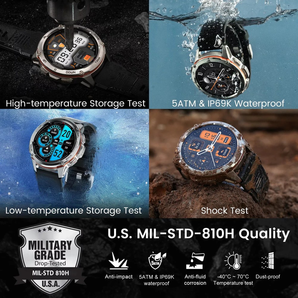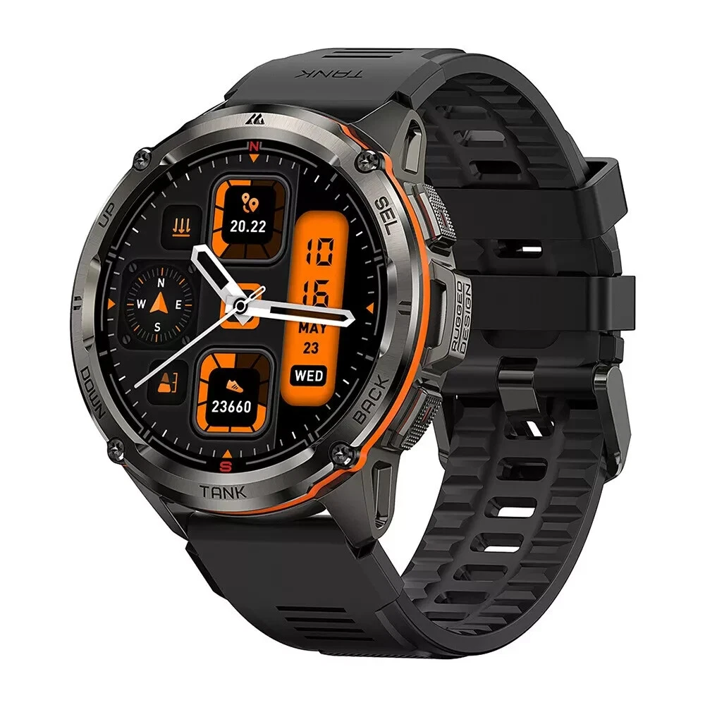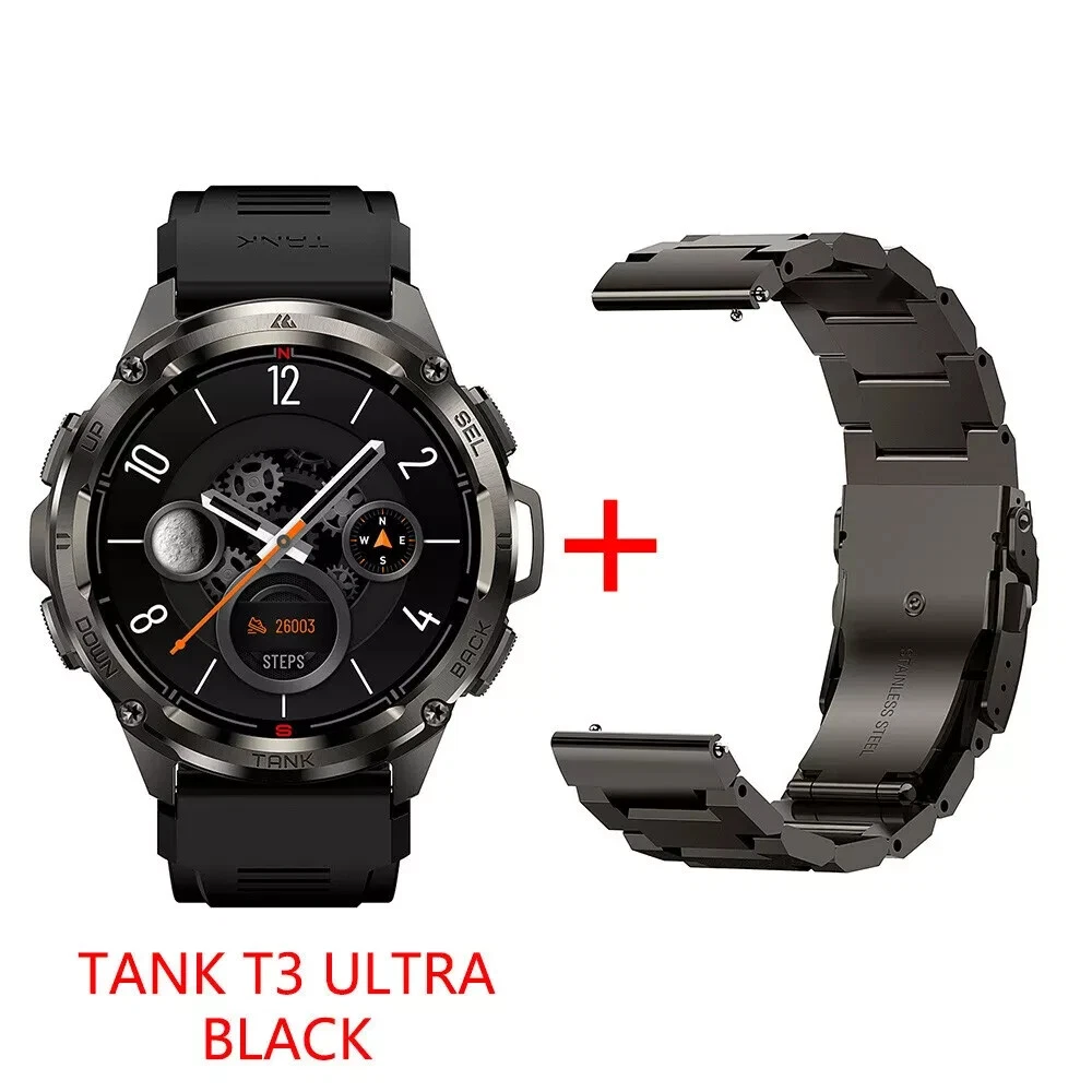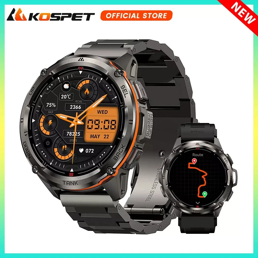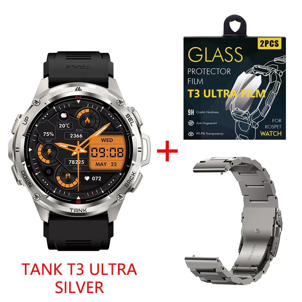 Kospet Tank T3 Ultra GPS Smartwatch - Military-Grade Durability & Health Monitoring Explore the capabilities of the Kospet Tank T3, the ultra GPS smartwatch designed for the modern man. This smartwatch features a robust full metal bezel and stainless steel back cover with an aluminum alloy body, built to withstand the rigors of daily wear. The 1.43" AMOLED display offers vivid visuals, complemented by a suite of health monitoring features including a heart rate monitor, blood oxygen level tracking, sleep tracking, and blood pressure measurement, ensuring you stay on top of your wellness. With military-grade durability certified to MIL-STD-810H and a professional waterproof rating, the Kospet Tank T3 is the ideal companion for both your active lifestyle and extreme adventures. The Kospet Fit app keeps you connected and in control with notifications, fitness tracking, and more, compatible with Android 5.1 & iOS 11.0 and above. The Tank T3's long-lasting 470mAh Pure Cobalt Battery powers up to 50 days of standby, 10-15 days of daily use, and 2-3 days with the Always-On Display, ensuring you're never without your timepiece.