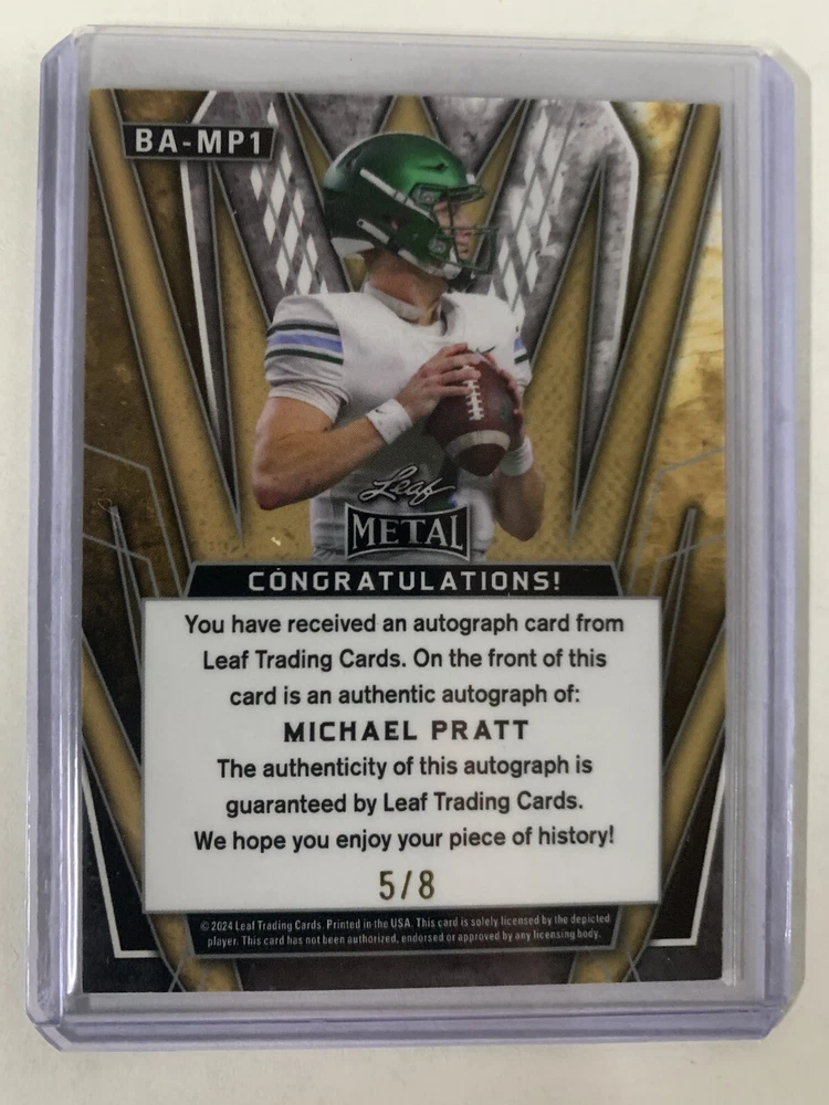 Print Run:/8Card Number:BA-MP1Season:2023Athlete:Michael PrattPlayer:Michael PrattSet:2024 Leaf MetalYear Manufactured:2023Year:2023Card Attributes:Autograph, Rookie, SerialNumberedSport:FootballCard Manufacturer:Leaf Trading CardsType:Sports Trading CardParallel/Variety:Blue MojoLeague:National Collegiate Athletic Association (NCAA), National Football League (NFL)Original/Reprint:OriginalProduct:Single-InsertTeam:Tulane Green Wave, Green Bay Packers, Tampa Bay BuccaneersAutograph Authentication:LeafAutographed:YesMaterial:MetalManufacturer:Leaf Trading CardsFeatures:Parallel/Variety, Rookie, Serial NumberedCard Name:Michael PrattPlayer/Athlete:Michael Pratt