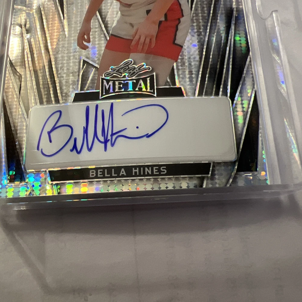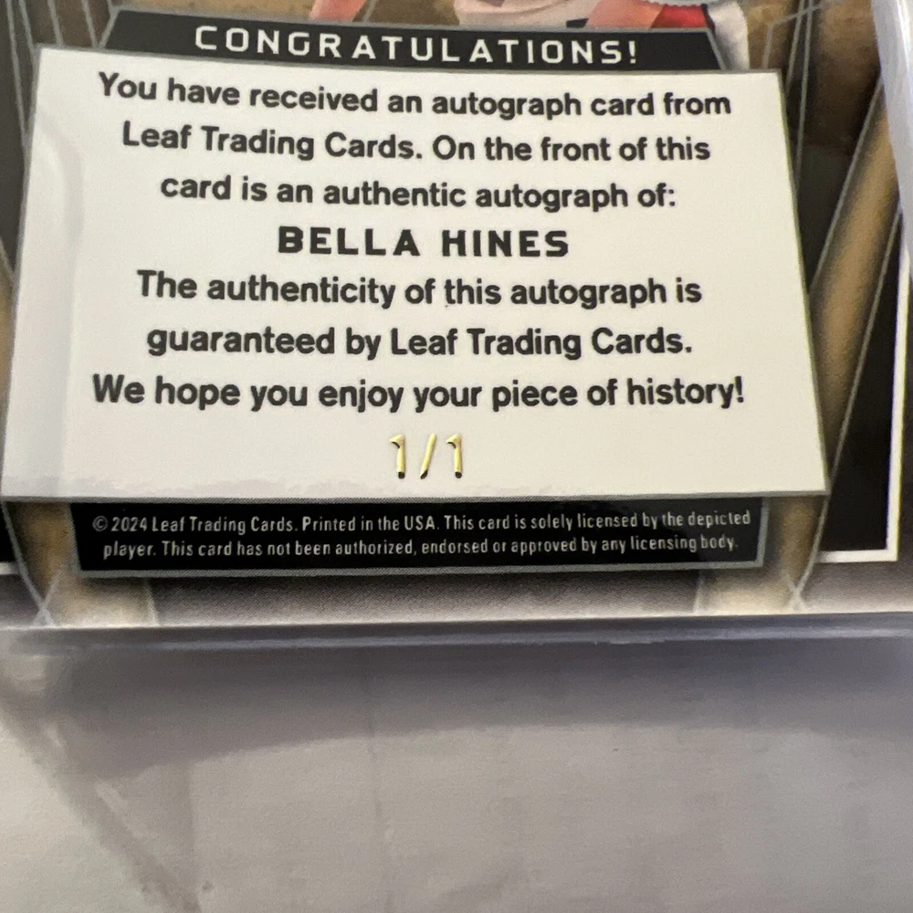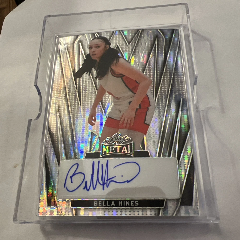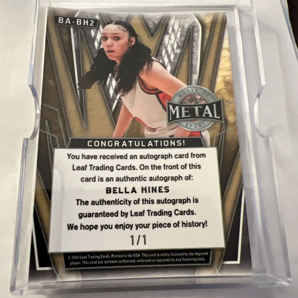 This rare and highly sought-after 2024 Leaf Metal Women of Sport trading card features the talented Bella Hines of LSU. The card boasts a stunning rainbow design and is autographed by Hines herself, making it a must-have for any basketball fan or card collector. With a print run of only one, this card is truly a unique and valuable addition to any collection. Its near mint or better condition ensures its longevity and appeal. Don't miss out on the opportunity to own this original, ungraded card from the manufacturer Leaf.