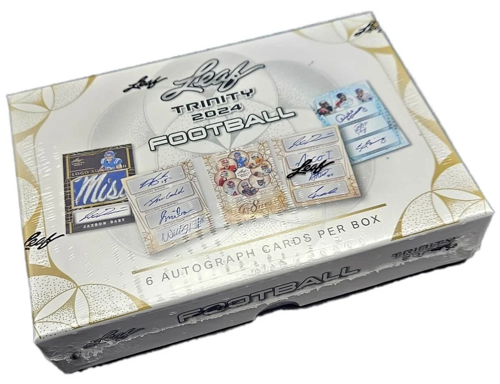 2024 Leaf Trinity Football Hobby Box 2024 Leaf Trinity Football Factory Sealed Hobby Box IN STOCK Not only will you find popular Trinity autographs including Clear Autographs and Autograph patches, but you can also find Dual Autos, Triple Autos, and 1-of-1 Logo Autographs. 2024 Trinity Football will also see the debut of the brand-new Goal to Go Memorabilia Autographs and Trinity Booklet cards featuring Future Gr8ness Autographs and Double Booked Memorabilia and Autograph Memorabilia cards! Look for the following players falling roughly 4 per case: Caleb Williams, Jayden Daniels, Carson Beck, Jalen Milroe, Jaxson Dart, Shedeur Sanders and Nico lamaleava. The most veteran content ever put into a Trinity product including Dan Marino, Eli Manning, Emmitt Smith, Peyton Manning, Josh Allen, Brock Purdy and more. 6 Autographs