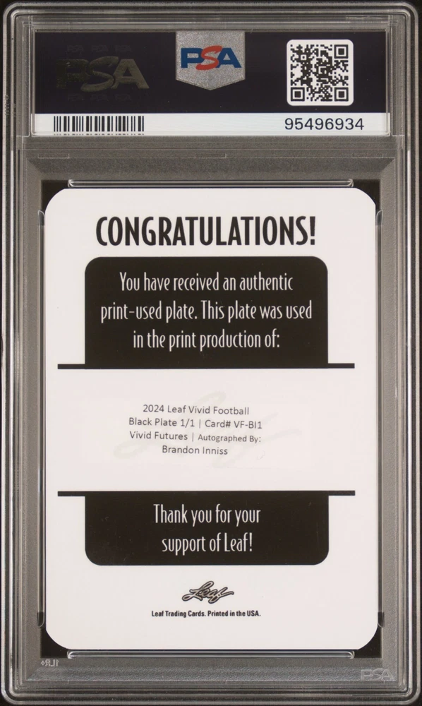 2024 Leaf Vivid Brandon Inniss Futures Black Printing Plate Auto 1/1 PSA 9 Auto