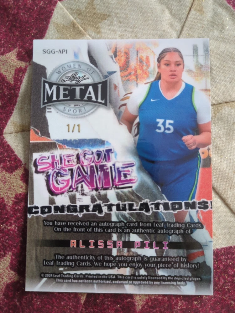 This rare 2024 Leaf Metal Women of Sport card features Alissa Pili, a standout basketball player. The card is autographed with a label or sticker, and is in near mint or better shape. It is part of the Autographs insert set and has a print run of only 1. The card is an original and comes with Leaf's autograph authentication. In addition, this card is a must-have for any sports trading card collector. It is a standard size card and was manufactured in the United States in 2024. The card number is SGG-API and it is part of the 2024 Leaf Metal Women of Sport set. Don't miss out on the chance to own this rare and unique card!