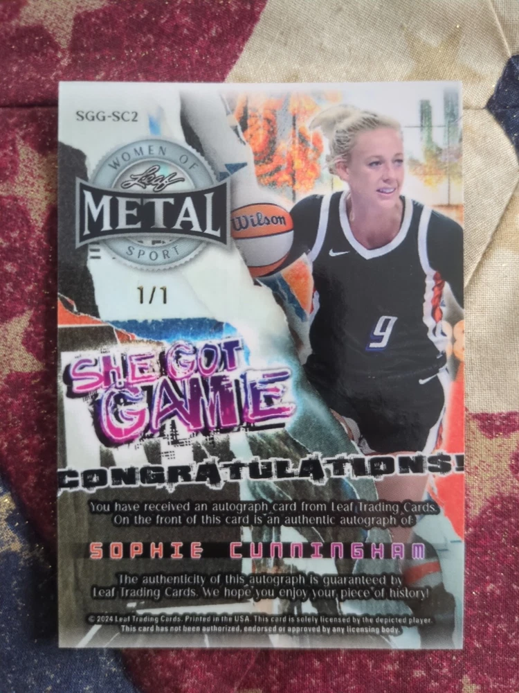 This rare 2024 Leaf Metal Sophie Cunningham She Got Game Purple ROOKIE AUTO card is a must-have for any Phoenix Mercury or basketball fan. The card features a stunning autograph by Sophie Cunningham, a label or sticker format that adds to the unique design of the card. The card is serial numbered and is a short print, making it even more valuable to collectors. The card is made of high-quality 20 Pt. card stock and has a Refractor parallel/variety, adding to its overall appeal. The card is an original and comes with Leaf's autograph authentication. This trading card is an excellent addition to any sports trading card collection and is sure to impress.