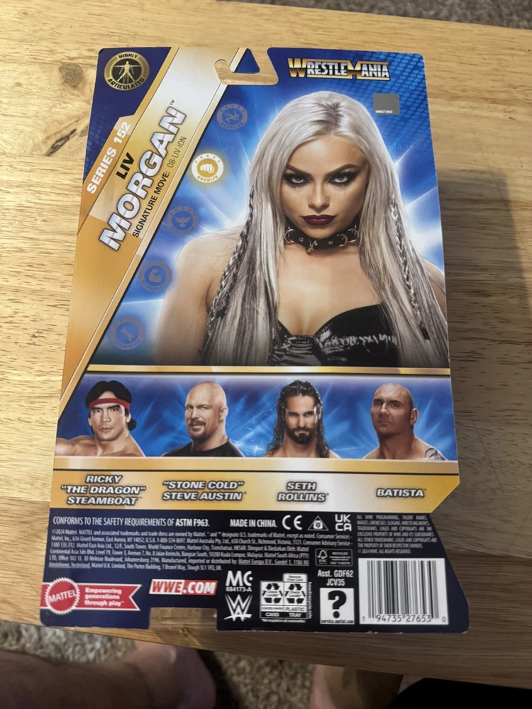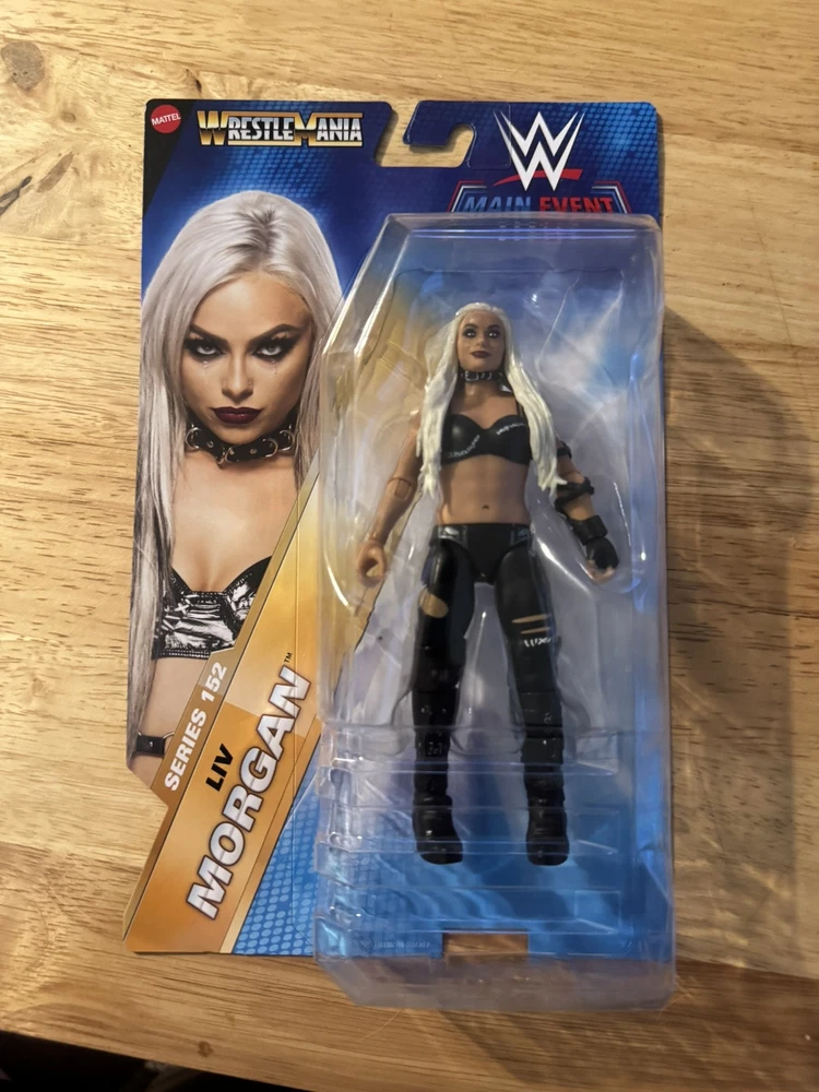 The product is a 2024 Mattel WWE Basic Series #152 WrestleMania Liv Morgan wrestling action figure featuring Liv Morgan in her WrestleMania attire. It is a collectible mask of Liv Morgan designed for WWE fans and wrestling enthusiasts.
