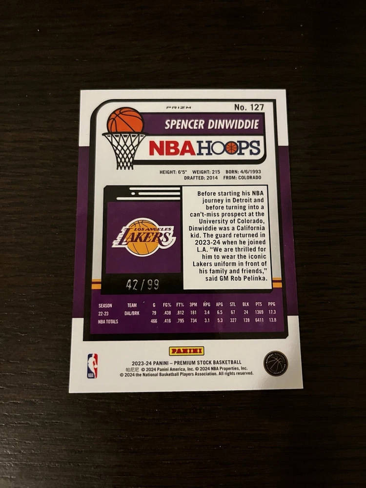 Elevate your collection with the 2024 NBA Premium Stock Spencer Dinwiddie #127 Blue Seismic card, limited to just 99 copies. This exclusive card features the dynamic Los Angeles Lakers guard and is a must-have for basketball aficionados and collectors alike. With its striking Blue Prizm parallel and the added rarity of serial numbering, it's a standout piece that celebrates the intensity and spirit of the sport. Crafted by renowned manufacturer Panini as part of the 2023-24 Panini NBA Hoops Premium Stock set, this card captures Spencer Dinwiddie's athletic prowess on the court. The card is ungraded, ensuring that it's in its purest form and ready for you to appreciate its quality and design. Whether you're a fan of the NBA, a follower of Dinwiddie's career, or a connoisseur of limited-edition sports memorabilia, this card is a valuable addition to any collection.