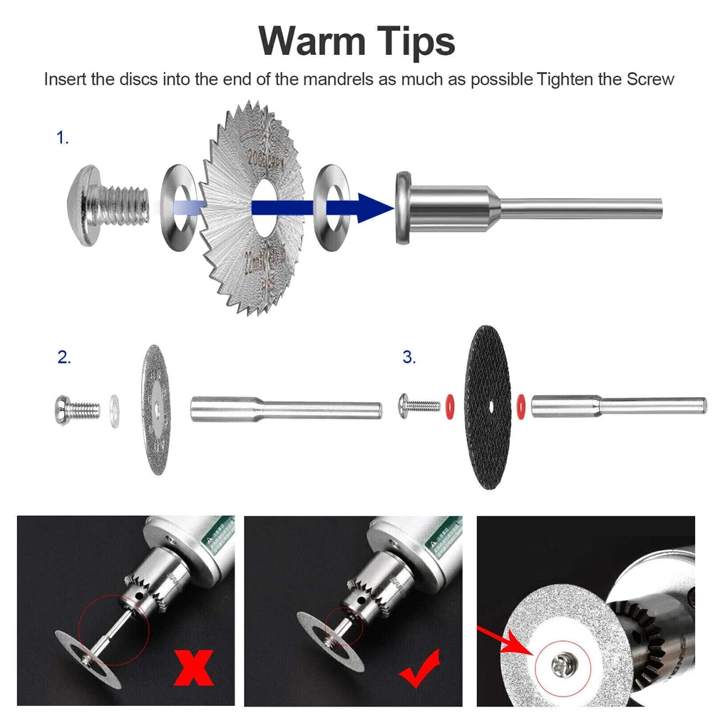 Hello dear customer. thank you for your purchase. If you encounter product problems or operational problems and other problems, you can contact our customer service immediately, and we will solve the problem for you within 24 hours. Please be sure to contact our customer service. I wish you a happy life! ! ! Product Specification Material:HSS / Diamond / Resin Shank Diameter:Approx.1/8" (3mm / 3.3mm) HSS Saw Blades Dia:22/ 25/ 32/ 35/ 44mm Diamond Cutting Disc Dia;25mm Resin Cutting Wheel Dial:32mm Small slit, high precision, high strength, fast work efficiency. Function: Cutting, Grooving and Trimming. Usage: Fit for dremel or other brand most rotary and air tools or Power die grinders. Product Feature HSS Mini Circular Saw Blades: Have 5 sizes (0.88"/ 1"/ 1.26"/ 1.39"/ 1.74") for cutting wood and plastic, case modification, circuit boards and DIY production. High precision and smooth cutting surface. Sharp, durable and long lasting. Diamond Cutting Wheels: Suitable for cutting stone, such as gemstones, glass, ceramics, porcelain, tiles, rocks. Cutting sharp, high density material, invariant and Not burning Wide range of use and long life. Resin Cutting Wheels: Reinforced with fiberglass for increased durability. Perfect for cutting metal including hardened steel, Iron, aluminum. Excellent Gift for DIY Enthusiasts: There are 3 types cutting discs to create a high working efficiency, perfect cutting effect, and convenient to cut, simple to use, safe and reliable. Package Included 30PCS( 5 × Mandrels+5 × HSS Circular Saw Blades+10 × Diamond Cutting Discs+10 × Resin Cut-Off Wheels On Oct 23, 2023 at 18:21:22 PDT, seller added the following information: