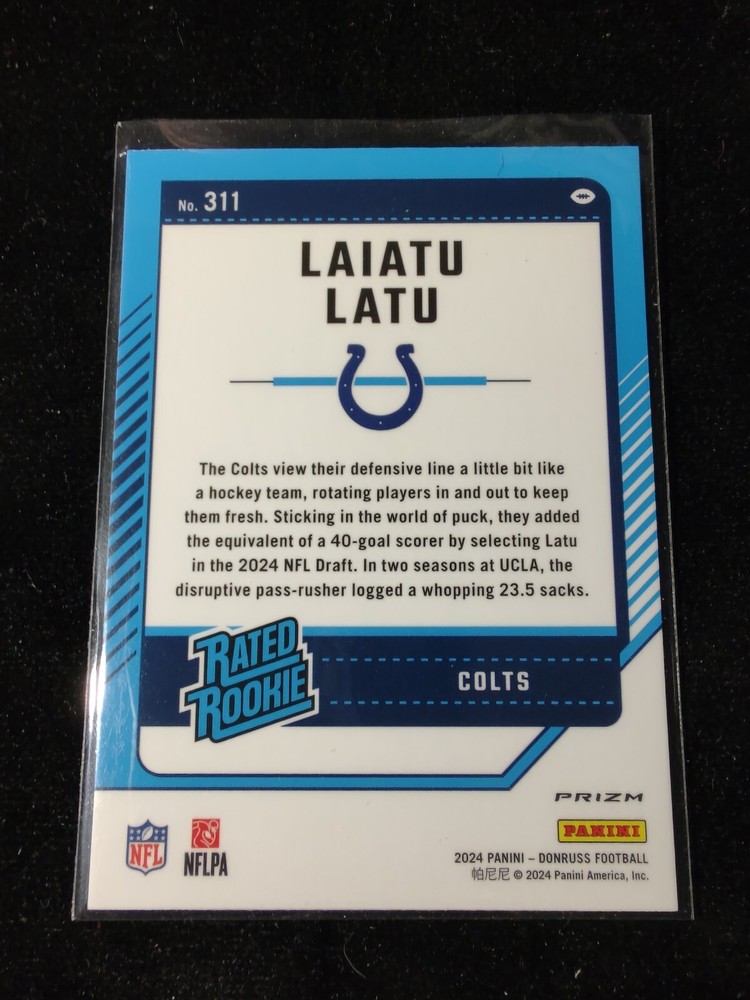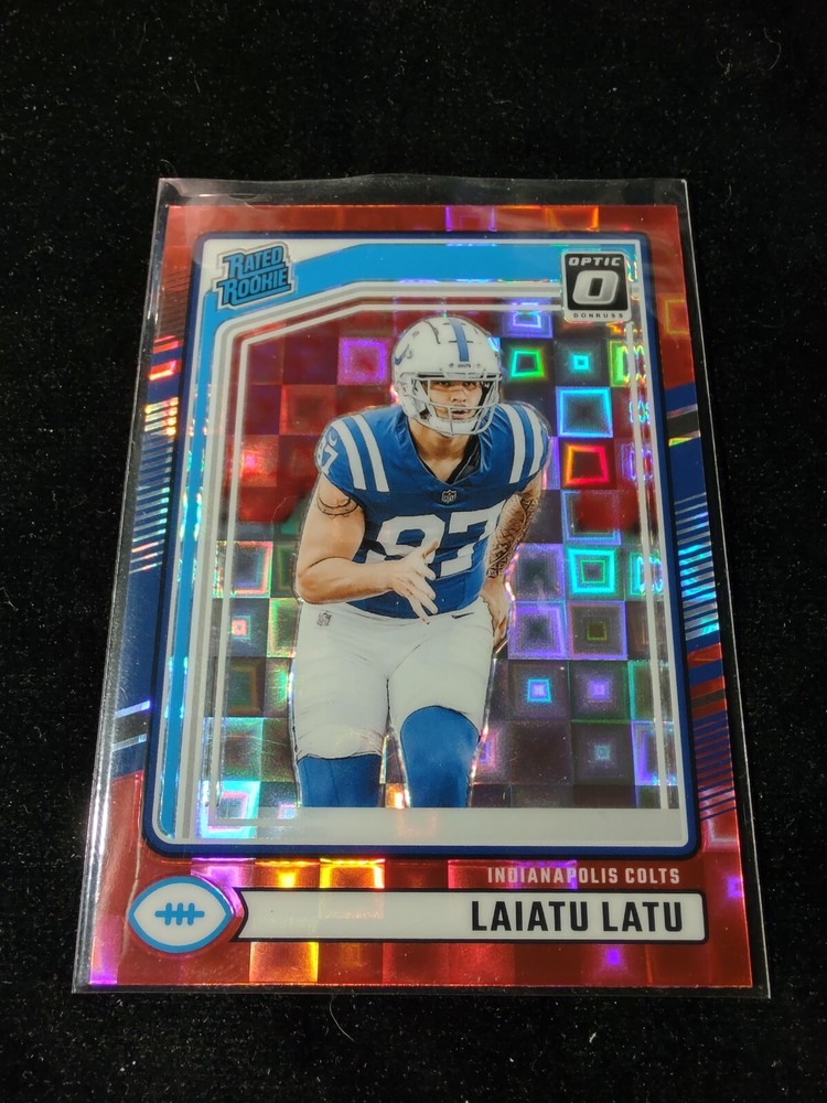 This is a rare 2024 Panini Donruss Laiatu Latu Rated Rookie Optic Red Pandora #311 trading card featuring the Indianapolis Colts player. The card is made of high-quality card stock material and has a refractor attribute. It is an original and licensed reprint with a short print, hologram, parallel/variety, limited edition, exclusive, rookie, checklist, collectors edition, insert, and chase feature. The card is a single product and is perfect for avid collectors of sports trading cards. It has been designed with the modern era of football and is in English language. The card is a red pandora parallel/variety and has been manufactured by Panini in the United States. It is a must-have for fans of the National Football League (NFL) and comes with a range of attributes that make it a unique and valuable addition to any collection.
