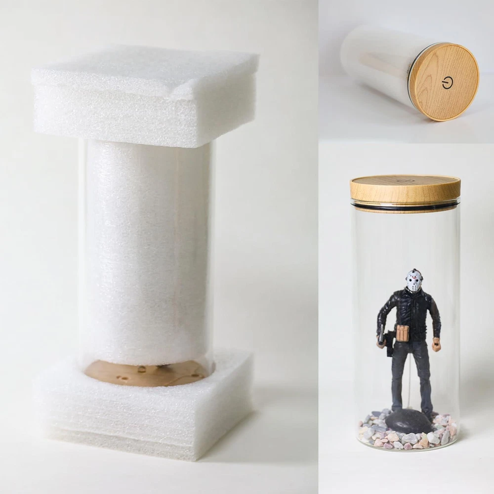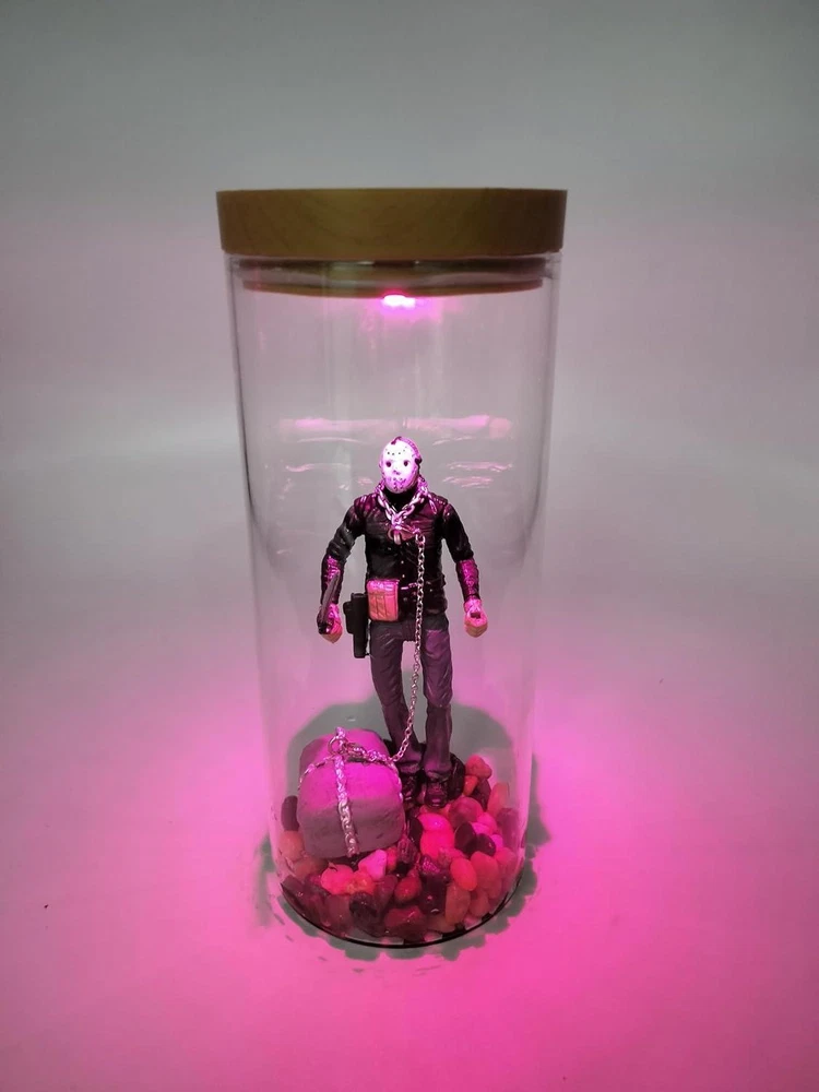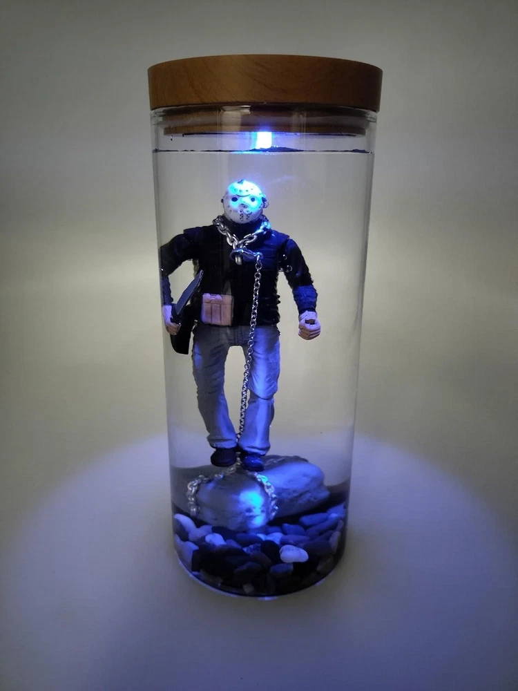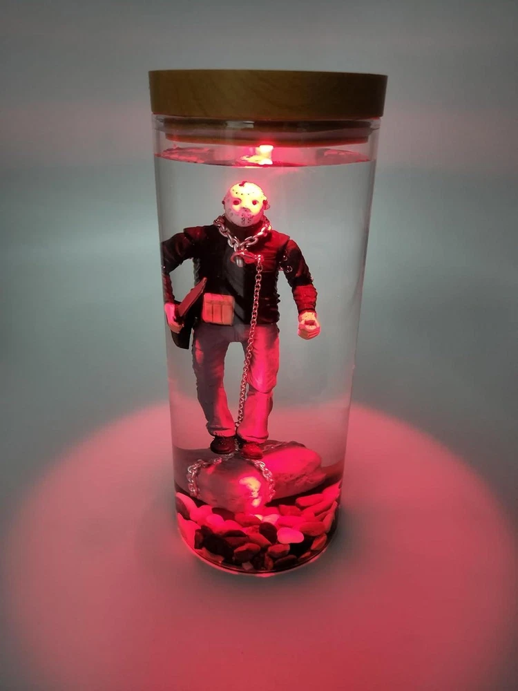 MOVIE MEMORABILIA UNIQUE GIFTS: This is the ultimate Jason Voorhees display stand to show off and show the world your love of horror and Jason! The item is custom framed by hand for a great piece of horror film memorabilia that is sure to be the centerpiece of your collection. MATERIAL: Water Horror Decor Halloween Lamp is cafted from premium Environmental friendly resin with a balance of quality and artistry, sturdy thick glass Genuine stained wood antique decorative style cover with on/off. Cylindrical acrylic jar with LED lighting effect. EXQUSITE CRAFT: Jason Voorhees Horror Movie Lamp is handcrafted to order and is a great piece of horror movie memorabilia that is sure to become the centerpiece of your collection. I think adding it to your horror themed kitchen or hanging it in your interior hallway would be great results, but I think your ideas are much more than that. HIGH-QUALITY MATERIAL: Water Lamp is cafted from premium Environmental friendly resin with a balance of quality and artistry, sturdy thick glass with lid Genuine stained wood antique decorative style cover with on/off switch. Cylindrical acrylic jar with LED lighting effect. UNIQUE HALLOWEEN GIFTS: The Horror Decor Halloween Lamp is custom framed by hand for a great piece of horror film memorabilia,You can give it to family and friends who love Jason. Product Description MOVIE MEMORABILIA UNIQUE GIFTS 1* WATER LAMP, The item is custom framed by hand for a great piece of horror film memorabilia that is sure to be the centerpiece of your collection.Why not try it? LED lighting effect EXQUSITE CRAFT WATER LAMP is handcrafted to order and is a great piece of horror movie memorabilia that is sure to become the centerpiece of your collection. I think adding it to your horror themed kitchen or hanging it in your interior hallway would be great results, but I think your ideas are much more than that. VARIETY OF ACCESSORIES 925 sterling silver weathered chain, genuine chain rock, gravel for lake bottom, glass attachment to hold Jason afloat, Velcro strap to hold battery, splash proof battery/electrical cover. MOVIE MEMORABILIA UNIQUE GIFTS This is the ultimate Jason Voorhees display stand to show off and show the world your love of horror and Jason! The item is custom framed by hand for a great piece of horror film memorabilia that is sure to be the centerpiece of your collection.