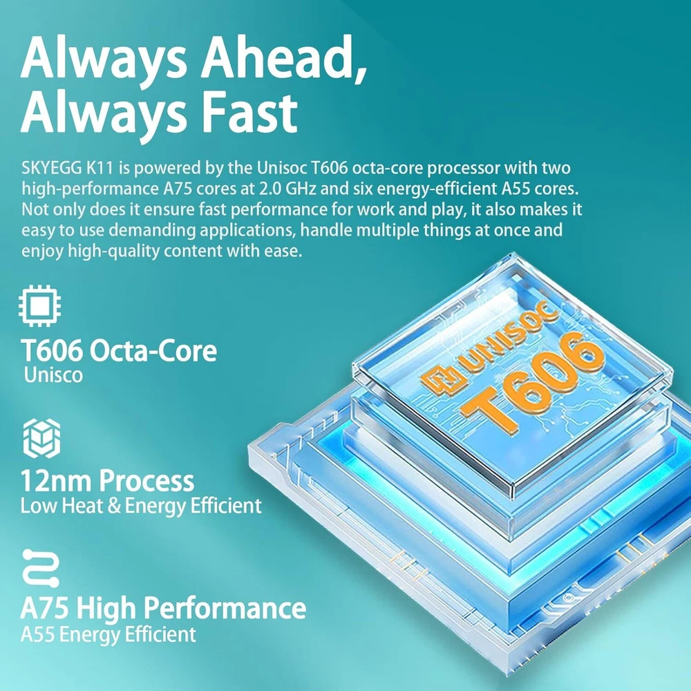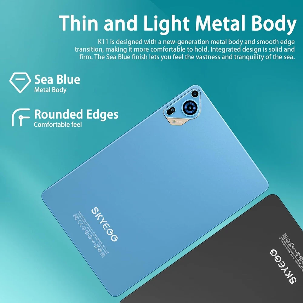 2024 Newest Android 14 Tablet 10 inch Octa-Core Tablets with 22GB Blue Product Details Standing screen display size: 10.1 Inches Screen Resolution: 1280 x 800 pixels Max Screen Resolution: 1280*800 Pixels Processor: 2 GHz Card Description: Dedicated Wireless Type: 802.11ac Brand: SKYEGG Model Name: K11 Memory Storage Capacity: 128 GB Screen Size: 10.1 Inches Display Resolution Maximum: 1280*800 Pixels LATEST ANDROID 14: The K11 Tablet is powered by the powerful Android 14 operating system,which delivers a more personalised,secure and easy-to-use system experience. Enjoy a new taskbar and a friendlier user interface with enhanced customisation options MORE STORAGE: Equipped with 22 GB (6+16 virtual) RAM and 128 GB ROM,the K11 tablet handles large apps and multitasking with ease. Whether you're streaming media or managing large amounts of data,it offers plenty of space and speed to meet all your needs OCTA-CORE PROCESSOR: SKYEGG K11 is powered by the Unisoc T606 octa-core processor with two A75 cores at 2.0 GHz and six power-efficient A55 cores. It not only ensures fast performance for work and play,but also makes it easy to use demanding applications 8000mAh BATTERY: The K11 Tablet Built-in newly upgraded 8000mAh Li-Polymer battery for more careful energy control, standby time and longer usage. With a versatile Type-C port, charging is fast and hassle-free