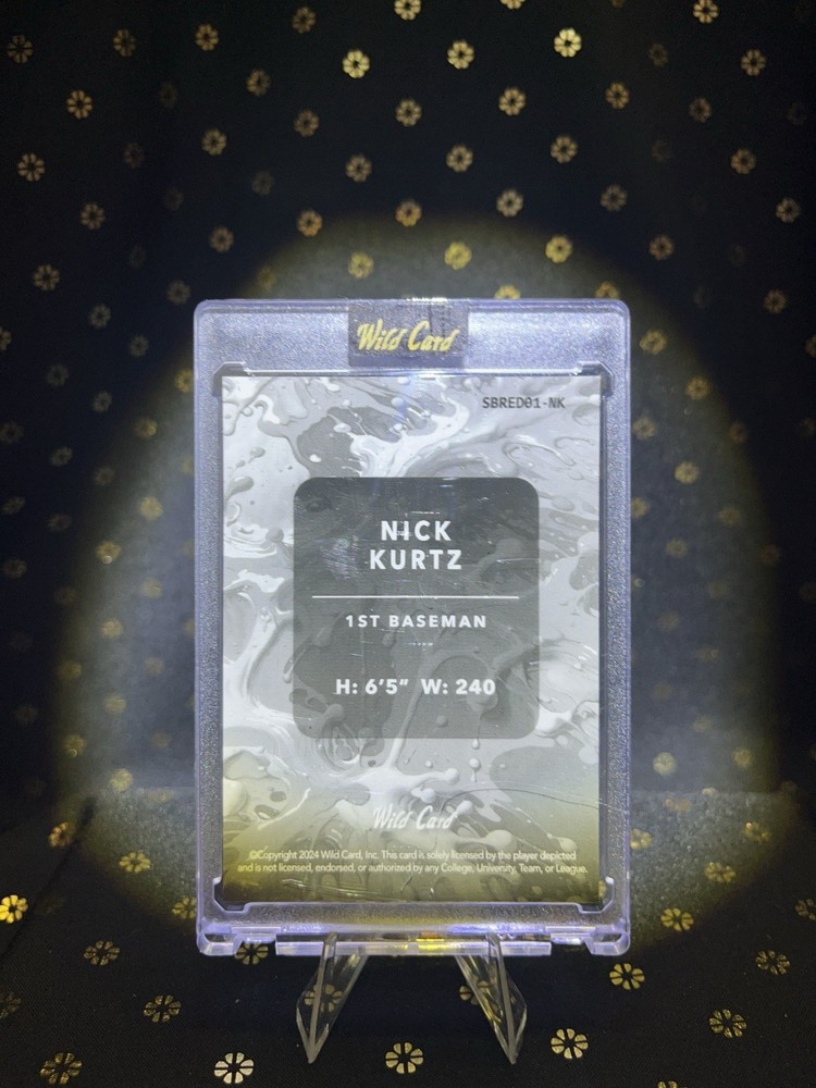 The 2024 Nick Kurtz Wildcard Splat Prc 3/6 trading card is a rare and unique collectible for baseball fans. This original card features Nick Kurtz from the Oakland Athletics, He was the unanimous winner of the 2025 American League (AL) Rookie of the Year award.
