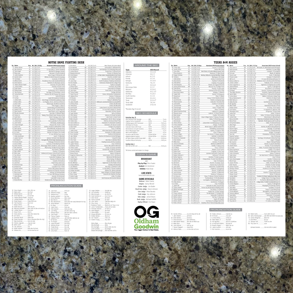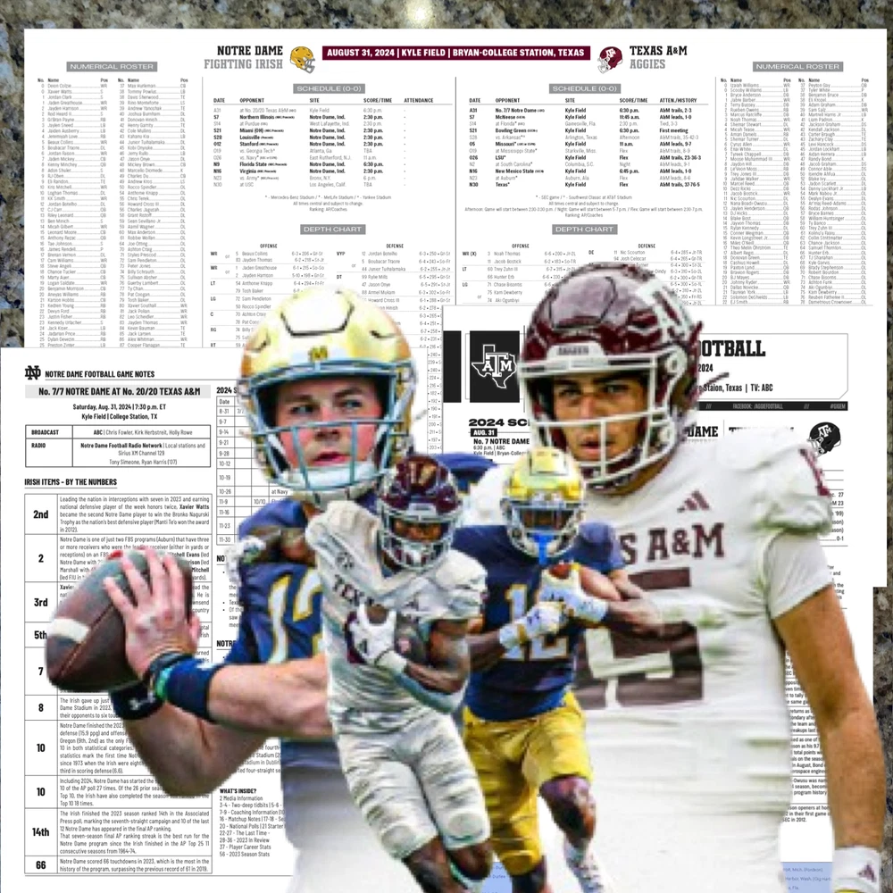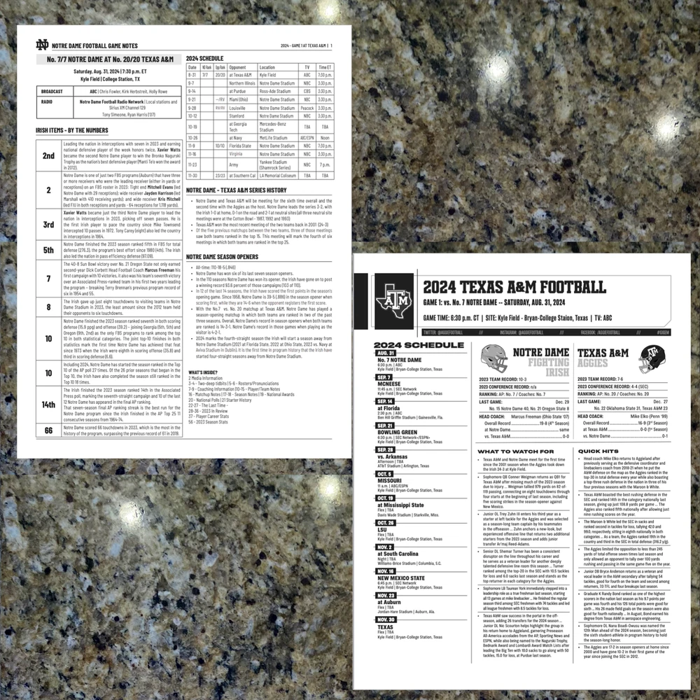 For sale, the game issued Flipcard and Media Program Notes from the legendary college opener game Notre Dame at Texas A&M. August 31, 2024. At Texas A&M Date: AUGUST 31, 2024 Stadium: KYLE FIELD Location: BRYAN-COLLEGE STATION, TEXAS What you get: 1. 11x17 Game Issued Media Issued Flipcard - Notre Dame vs Texas A&M 2. Texas A&M Media Program Game Note (1-page) 3. Notre Dame Media Program Game Note (1-page) 4. Plastic protector sheet