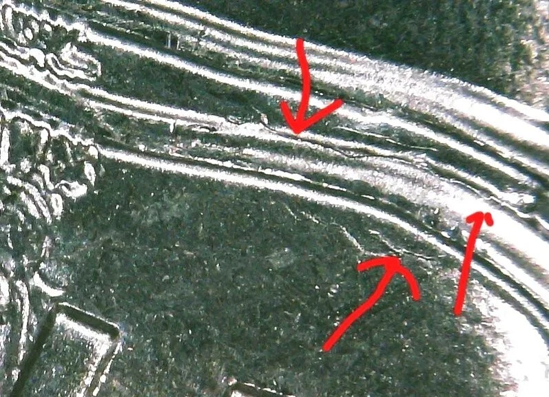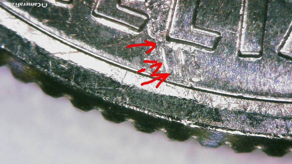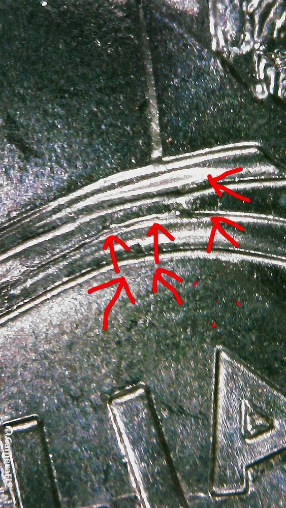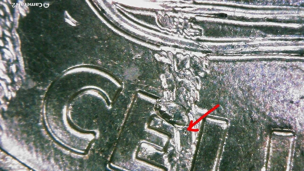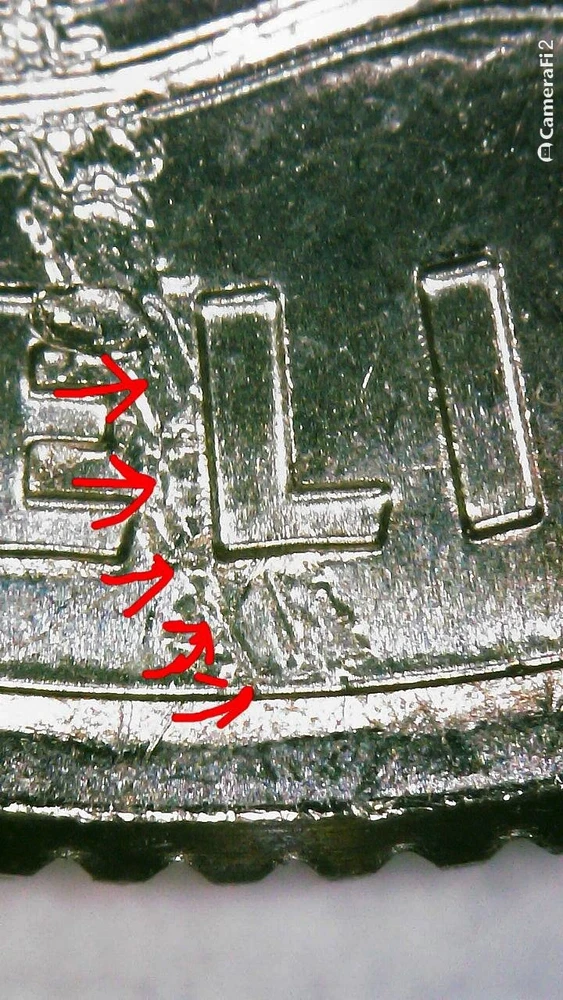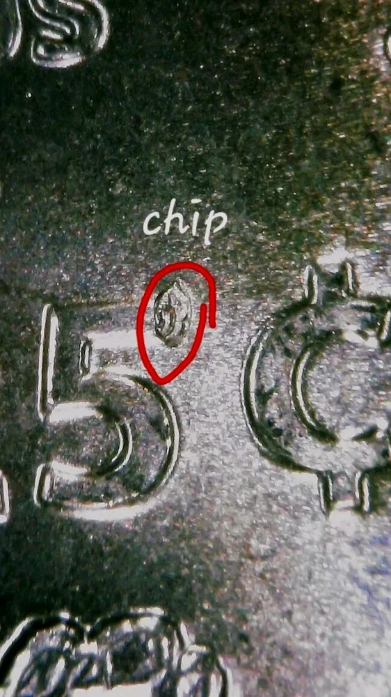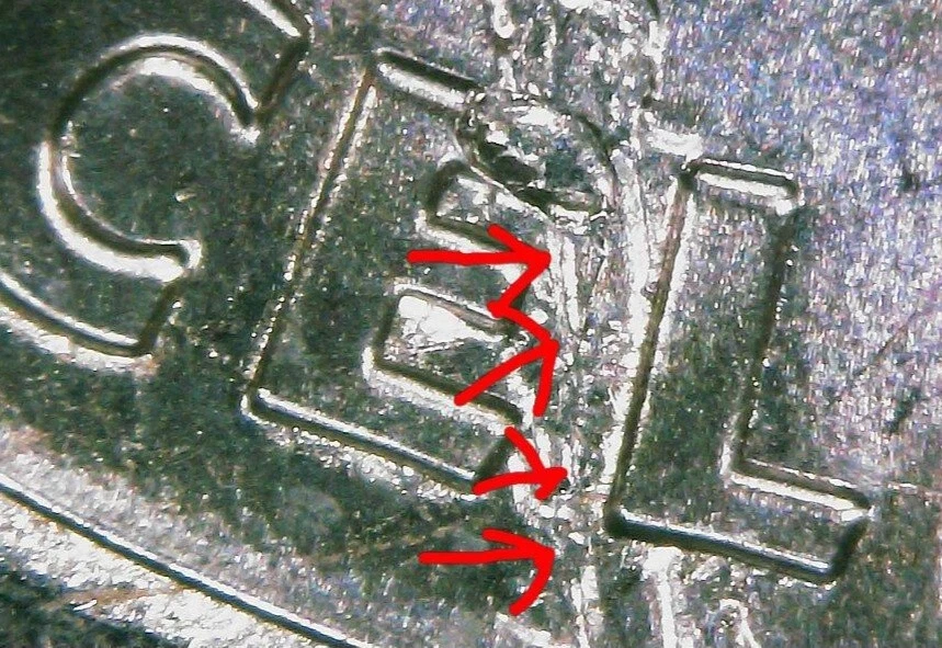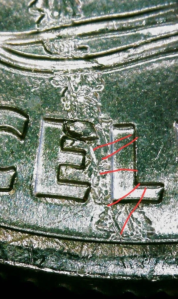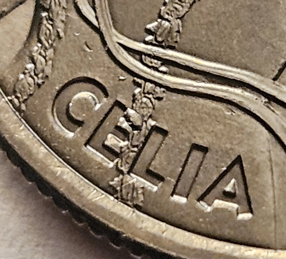 Very fine crack from inner rim runs up and thru print on dress straight into upper crossbar on E in Celia. That's where the interior cud obscures upper bar on E and print on dress right next to it. There are also multiple cracks & chips ON, and IN, parts of the ribbon. Finally there is a die chip on the 5 digit at the very right end of crossbar on the digit. This came out of a fresh roll, is uncirculated and a nice multi error coin.