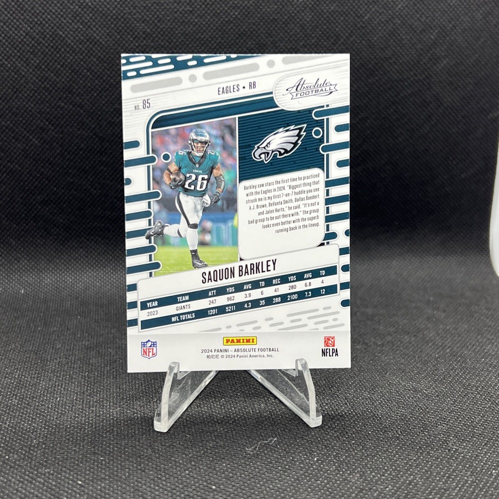 The product is a 2024 Panini Absolute trading card featuring Saquon Barkley of the Philadelphia Eagles in the National Football League (NFL). This sports trading card is part of the base set and is made of card stock, with a standard size for trading cards. The card is an original, not a licensed reprint, and does not feature an autograph. It is manufactured in the United States by Panini and is numbered #85 in the set. This collectible item is designed for fans and collectors of football memorabilia.