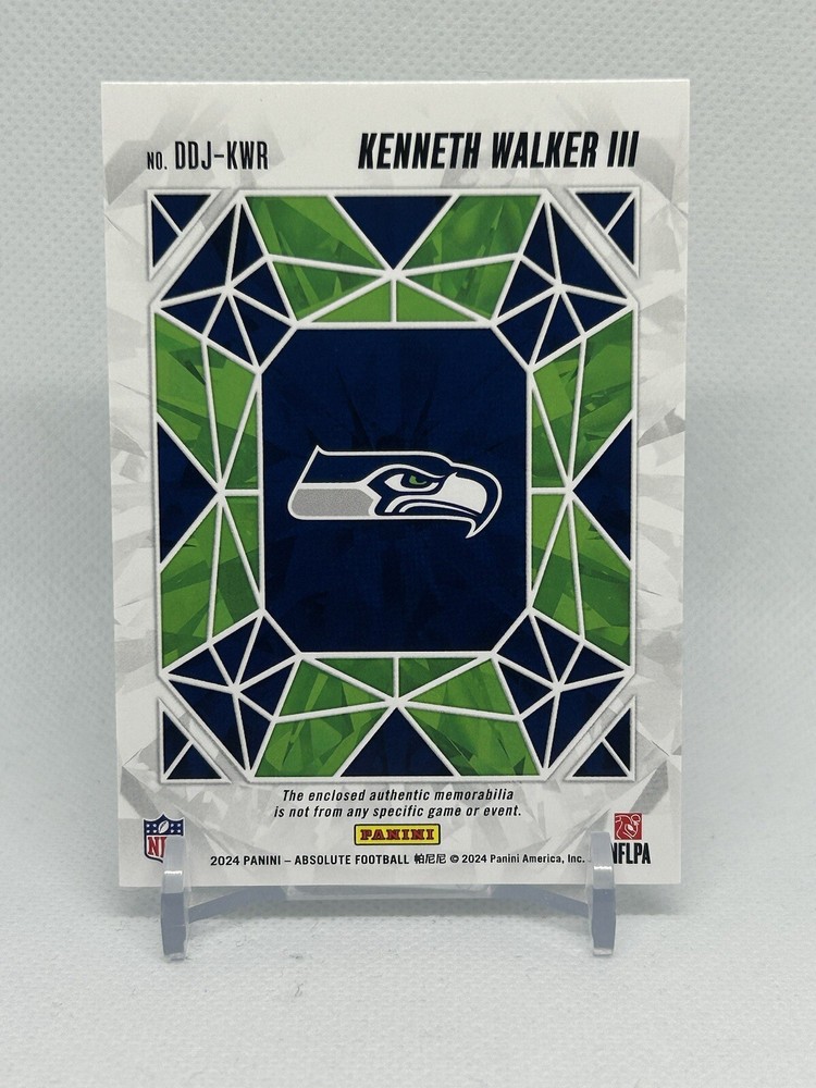 The product is a 2024 Panini Absolute trading card featuring Kenneth Walker III of the Seattle Seahawks. This card is part of the Draft Diamonds subset, with a patch of memorabilia embedded in it. The card number is DDJ-KWR, and it is from the 2024 football season. The card is not autographed, and it is manufactured by Panini. This trading card would be a valuable addition to any football card collection, especially for fans of the Seattle Seahawks or collectors of Kenneth Walker III memorabilia.