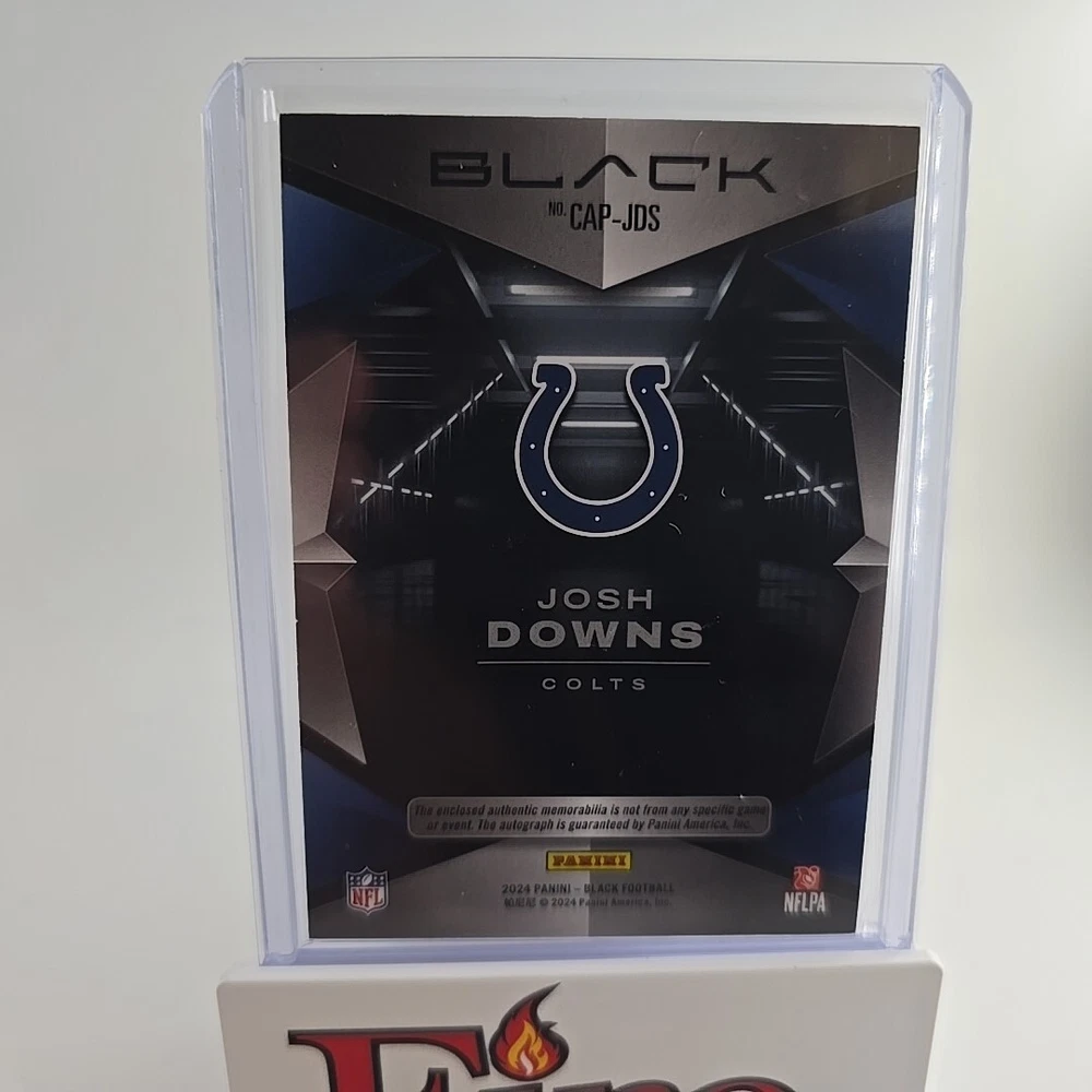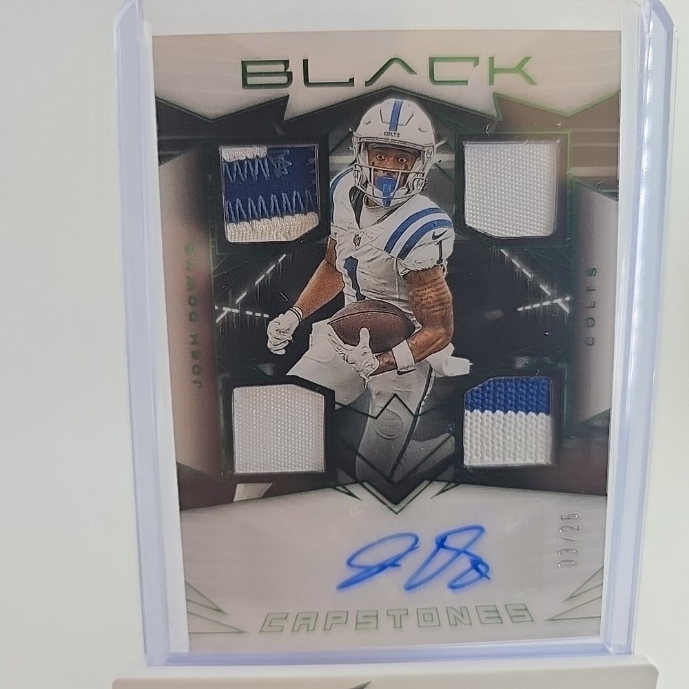 This is a 2024 Panini Black Emerald Capstones #CAP-JDS trading card featuring Josh Downs of the Indianapolis Colts. This autographed card is serial numbered 3/25 and includes four pieces of memorabilia. It is a limited edition Emerald insert from the Panini Black set, signed by Josh Downs. Great for any Colts fan or Nfl fan. Thank you for your interest, don't let it get away bid today!