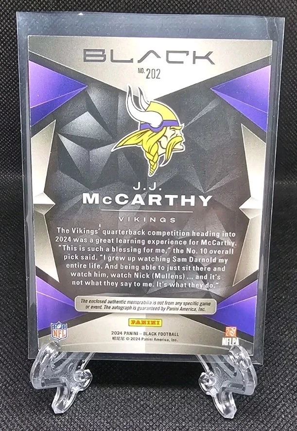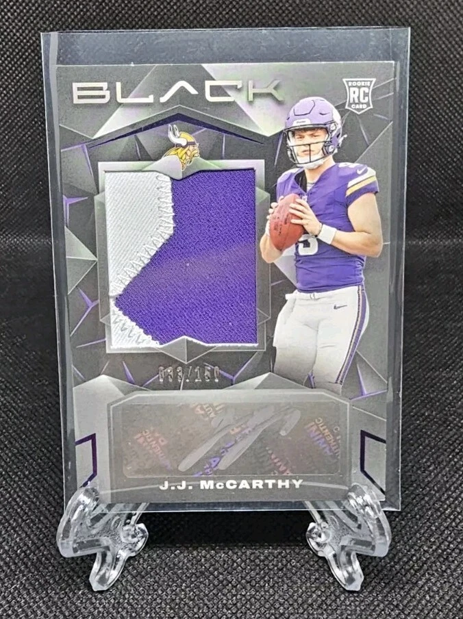 This is a 2024 Panini Black trading card featuring J.J. McCarthy of the Minnesota Vikings. It is a rookie card with an autograph and a premium patch, limited to a print run of 150 cards. The autograph is authenticated by Panini Authentic and the card is made of card stock. The card is a Silver Script parallel, making it a valuable addition to any collection.