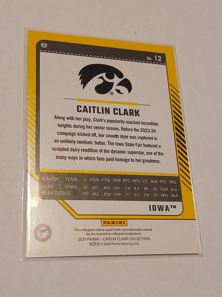 This 2024 Panini Caitlin Clark Collection sports trading card features the rookie and insert set, with card number 12 in the Base Donruss set. The card showcases the basketball player Caitlin Clark, who plays for the National Collegiate Athletic Association (NCAA) league. The card is manufactured by Panini and is part of the 2024 season set. This trading card is perfect for fans and collectors who appreciate the sport of basketball and the NCAA league. It is a great addition to any collection or as a standalone piece for display. Get your hands on this unique and rare card today!