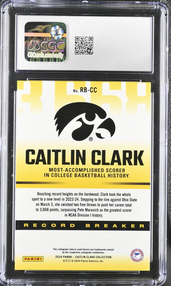 You are purchasing a 2024 Panini Caitlin Clark Collection Caitlin Clark #RB-CC Record Breaker CGC 10. You will receive the exact item in the photographs. Thank you for looking. Listed With Mascot .