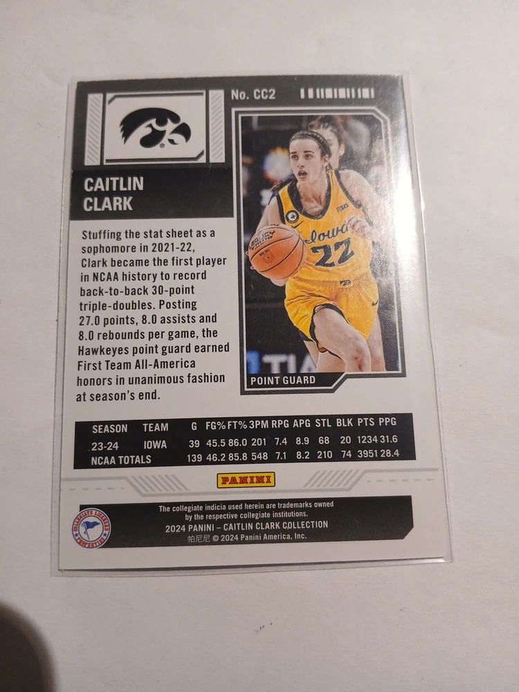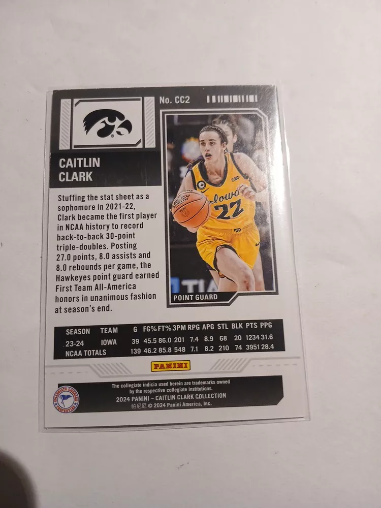 This 2024 Panini Caitlin Clark Collection sports trading card features the rookie and insert set, College Contenders, with card number CC2. The card showcases the basketball player, Caitlin Clark, who is part of the National Collegiate Athletic Association (NCAA) league. The card is manufactured by Panini and is a great addition to any sports trading card collection. The season for this card is 2024 and it falls under the category of Sports Mem, Cards & Fan Shop and Trading Card Singles.