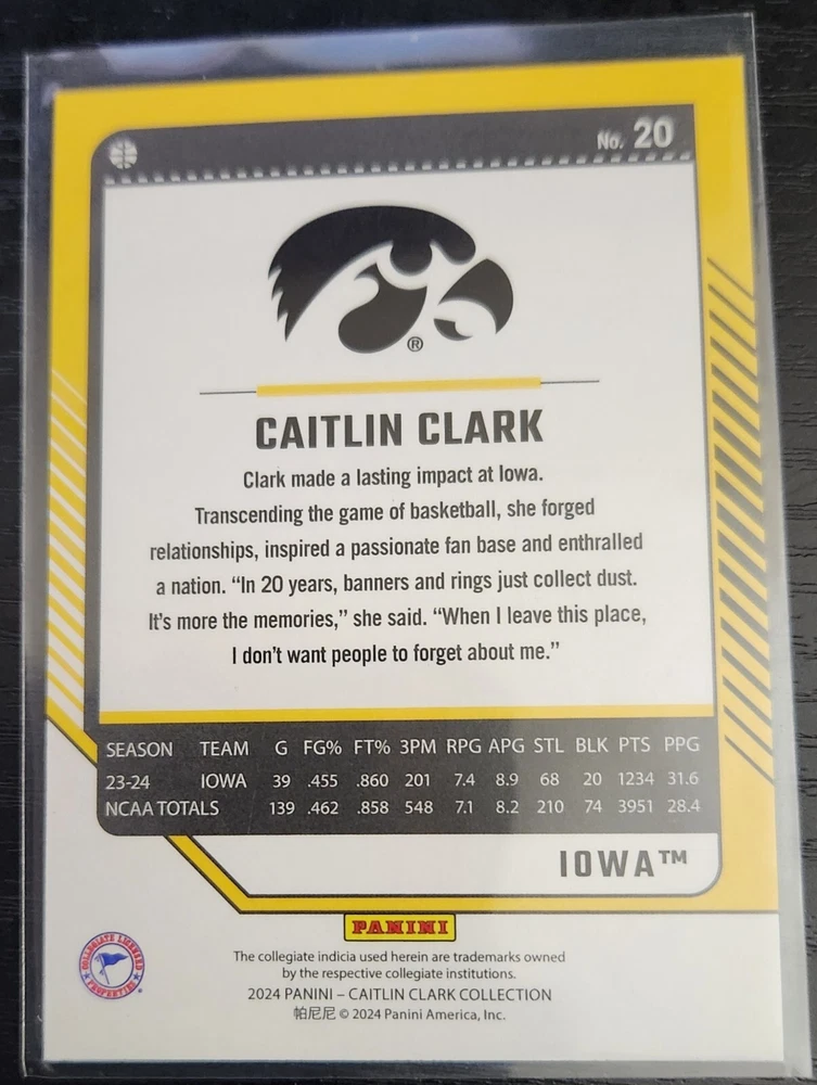 The product is a 2024 Panini Caitlin Clark Collection Donruss #20 trading card featuring Caitlin Clark, a player for the Indiana Fever in the Women's National Basketball Association (WNBA) and the Iowa Hawkeyes in the National Collegiate Athletic Association (NCAA). This card is a Target Red Foil parallel variety, making it a rare and collectible item for basketball fans. It is an original licensed reprint with autograph authentication by Donruss, but it does not come with an autograph. This card is part of the rookie insert series for the 2024 season.