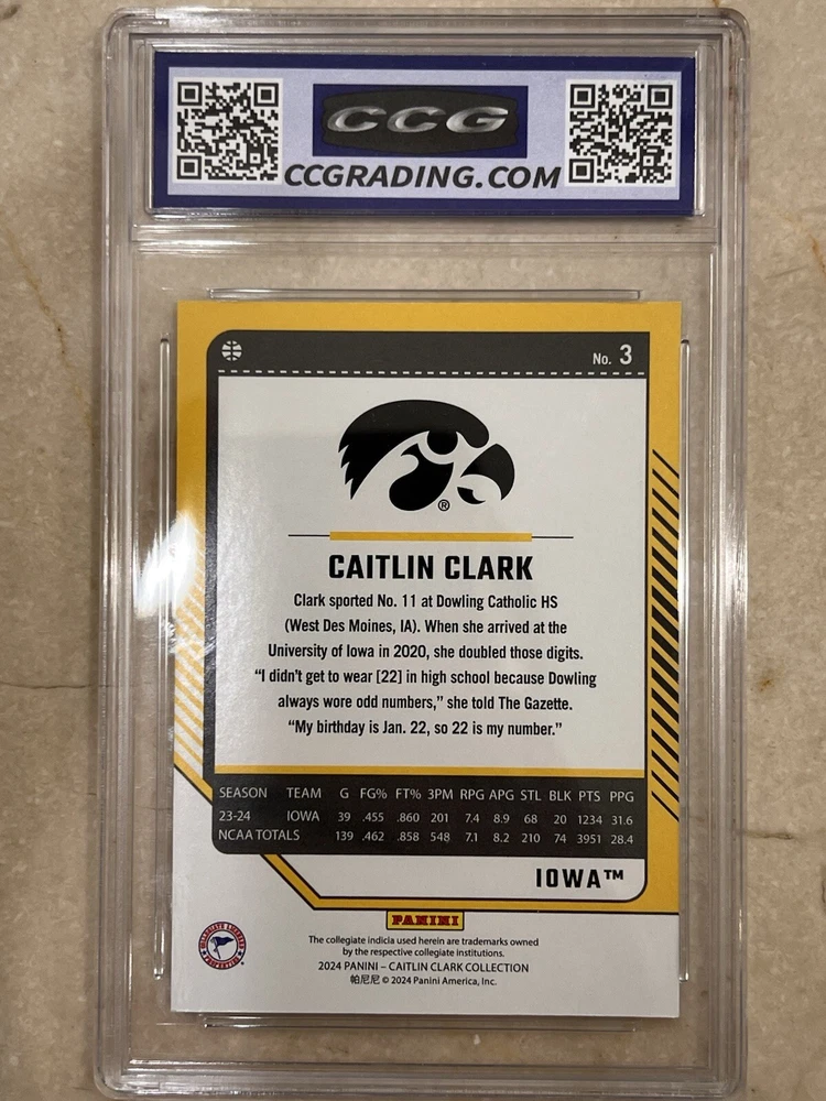 Elevate your collection with the 2024 Panini Caitlin Clark Collection from Donruss, featuring card #3 - a trading card showcasing the emerging talent of Caitlin Clark. This card comes professionally graded with a pristine 10 grade, ensuring its top-notch quality and preserving its value for years to come. As part of the 2024 series, this card captures the essence of the season, making it a must-have for enthusiasts and collectors alike. Whether you're a fan of the athlete or a connoisseur of sports memorabilia, this card is a standout piece that epitomizes the spirit of the sport.