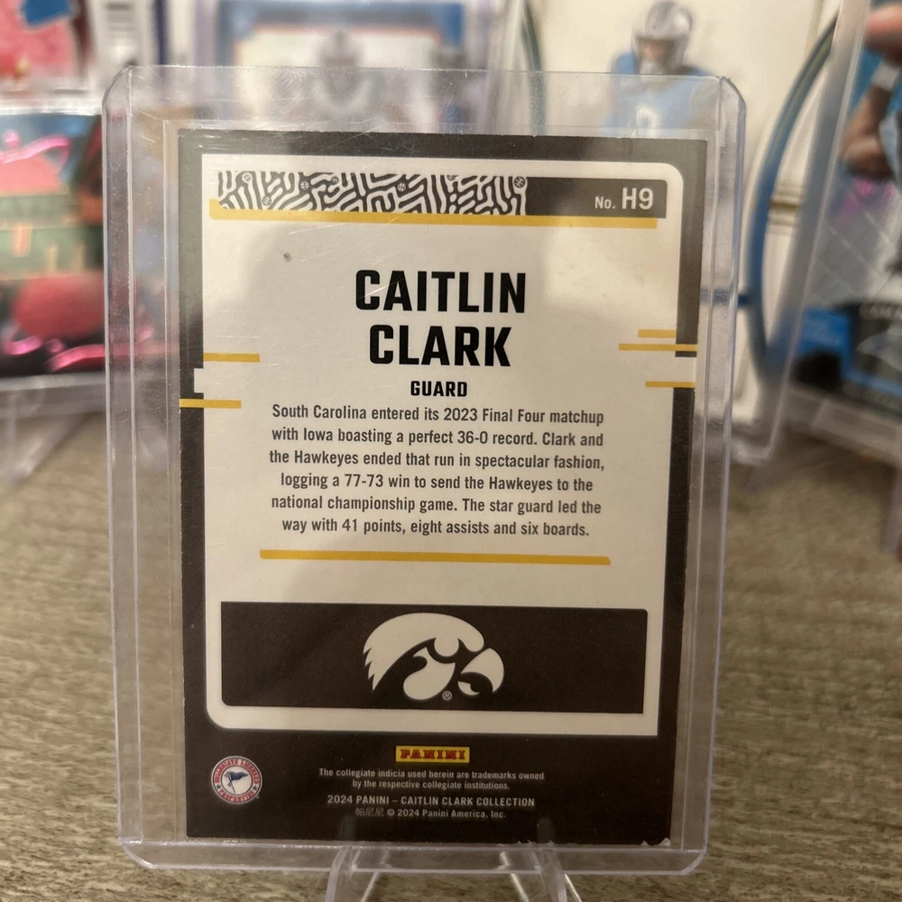 This 2024 Panini Caitlin Clark Collection Highlights card features the talented Iowa State Cyclone women's basketball player. The card is a must-have for any collector who appreciates sports trading cards. The card is in excellent shape, with no noticeable flaws or defects. It is a great addition to any collection of trading card singles, and would make an excellent gift for any sports fan. Don't miss your chance to own this rare and highly sought-after card.