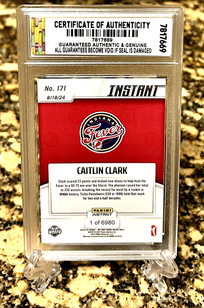 This is a Presale Order Set for 40 Day Delivery. The #171 card is just an Example of what the BRAND NEW Iowa Retires Jersey #CCA card will look like GRADED GEM-MT 10. You will receive a JDCC Authorized & Inspected AUTHENTIC MEMORABILIA Micro Graded GEM-MT 10 2024-25 Panini Instant CAITLIN CLARK 2024 Iowa Retires #22 Jersey GRADED GEM-MT 10 Rookie #CCA. W/H COA! Cards are Professionally inspected, encased and sealed by JDCC - JD’S Coins & Collectibles Inc.! This item is encased in a Crystal Clear Slab with tamper proof #'d hologram sticker and Certificate of Authenticity marked label for extra security and authenticity! The matching SERIAL #’D JDCC COA will accompany this item. Any tampering or removal of the hologram labels will void the JDCC grading authenticity of the item encased. For further protection the case is fitted with a plastic sleeve. It is best to keep the item in the plastic sleeve to protect the slab from any scratches, etc. This is a beautiful product for display and safekeeping! PLEASE FOLLOW OUR STORE FOR NEW INVENTORY & EXCLUSIVE OFFERS! I combine shipping at .50 cents per additional item capped at $9.99. International rates are $14.99. Feel free to send me offers for multiple items and qualify for discount shipping rates and lower costs per item! I send daily invoices every morning so be sure to wait for your combined shipping invoice before checkout or request an invoice when you are ready to pay. Please keep in mind shipping and handling fees don't just cover postage but also ebay/paypal fees, supplies, taxes and other costs. 5 Star feedback is Greatly appreciated and FOLLOW our store for New Inventory! Good luck and enjoy!