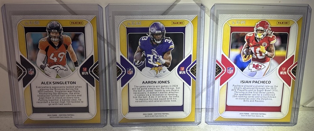 2024 Panini Certified Isiah Pacheco, Aaron Jones, Alex Singleton Gold Team Lot. Chiefs, Vikings, & Broncos