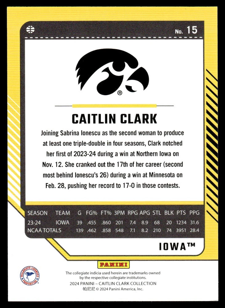 Behold the breathtaking 2024 Panini Donruss 15 Caitlin Clark /22 Iowa, a card that is a true testament to both the athlete's stellar performance and the Donruss brand's commitment to quality. With card number 15, this piece is a rare gem, limited to just 22, making it a precious addition for any sports card aficionado. This card features Caitlin Clark, one of the most remarkable talents from Iowa, which enhances its value and desirability for any collector. Its aesthetics are as striking as the player it represents. The design is clean, modern, and captures the essence of the sport in a tangible form. Donruss, a brand synonymous with superior quality and excellence, has truly outdone themselves with this card. The impeccable finish, the vibrant colors, and the crisp, clear image of Clark are all hallmarks of Donruss's workmanship. This 2024 Panini Donruss 15 Caitlin Clark /22 Iowa card is not just a collectible, it is a piece of sports history encapsulated in a form that you can hold. It's a must-have for die-hard sports fans, dedicated collectors, or anyone who appreciates the beautiful blend of sports and art. The rarity and significance of this card make it a treasure that will only appreciate with time. Don't miss out on the opportunity to own this remarkable piece of sports memorabilia.