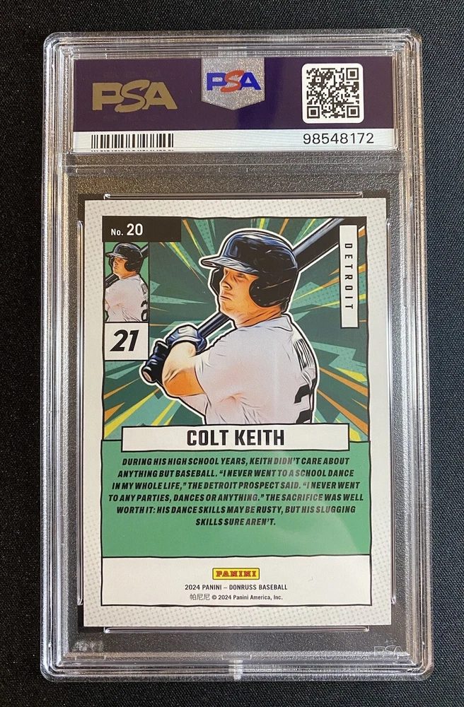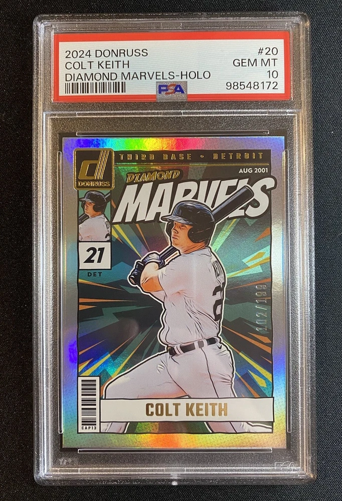 This 2024 Panini Donruss Diamond Marvels Colt Keith Holo Silver /199 card is a must-have for any baseball fan. Featuring a stunning design and high-quality print, this sports trading card showcases the rookie player in all his glory. Graded by Professional Sports Authenticator (PSA) with a perfect score of 10, this card is a true gem for collectors. The card is part of the 2024 Panini Donruss set and features the Detroit Tigers rookie player in his Tigers uniform. With its unique Holo Silver parallel/variety, this card is a rare find that is sure to impress. Whether you are a fan of Major League Baseball (MLB) or simply love collecting sports trading cards, this item is a great addition to any collection.