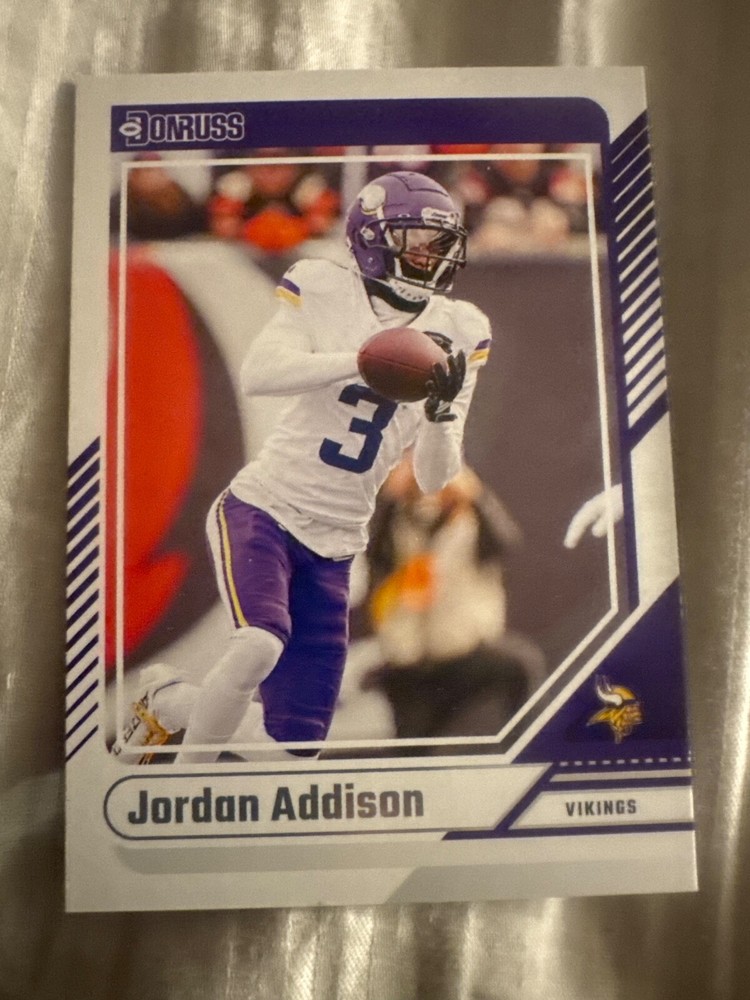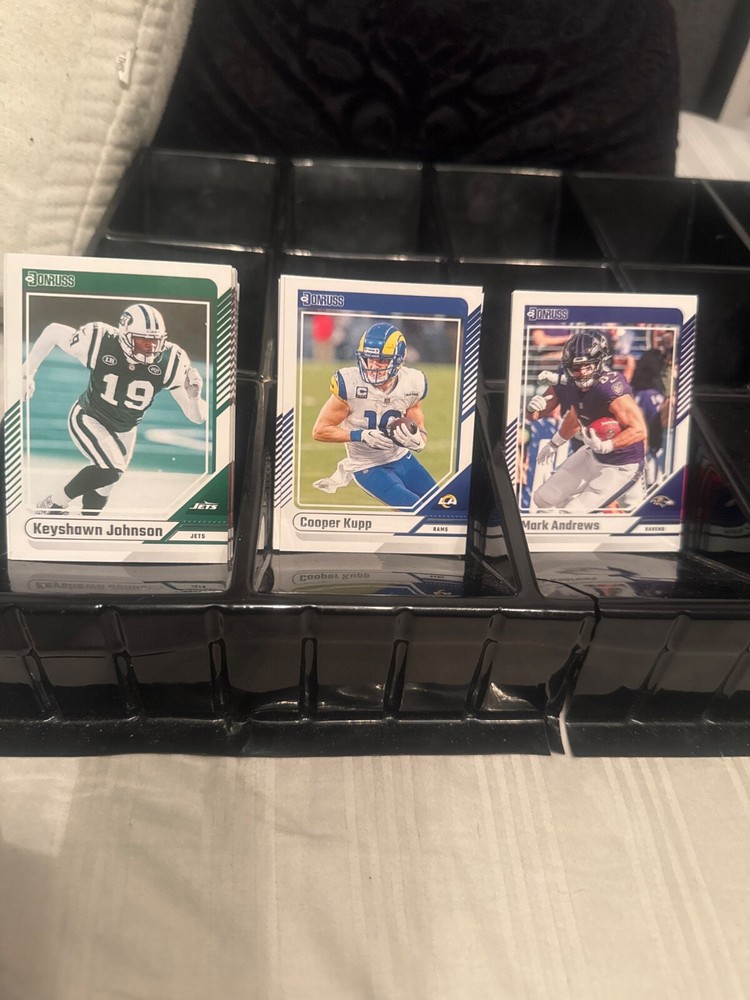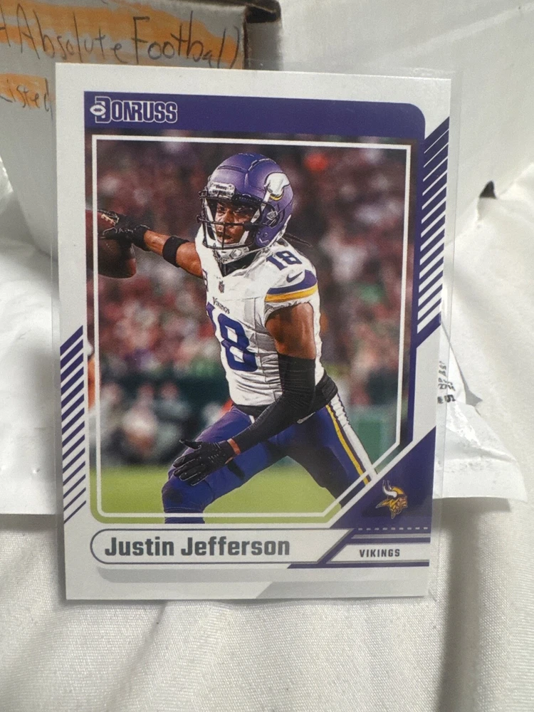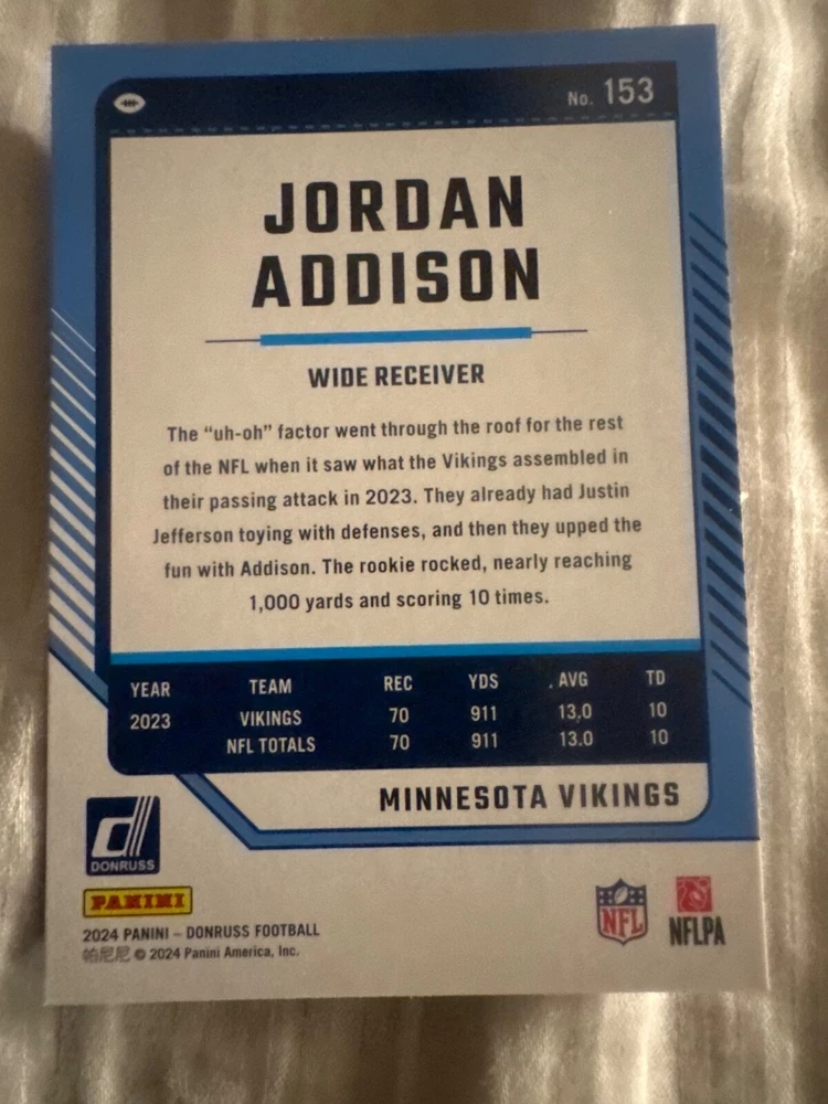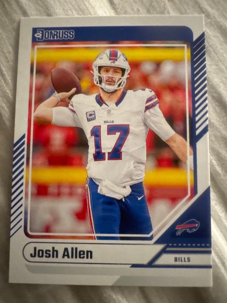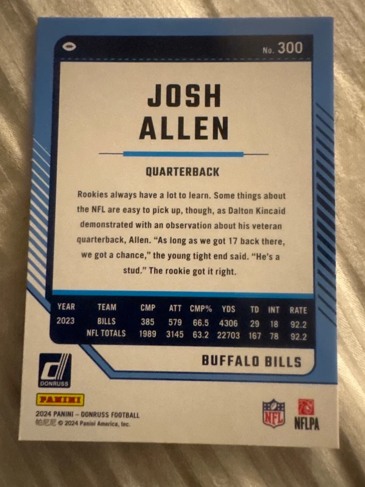 The product is a set of 2024 Panini Donruss Football trading cards, specifically cards numbered 151-300. These are standard-sized cards made of card stock, featuring players from the National Football League (NFL). The cards are part of the base set and are in English. They are original Panini cards manufactured in the United States. The set does not include autographed cards and is not considered vintage. Free shipping is available for completing a set.