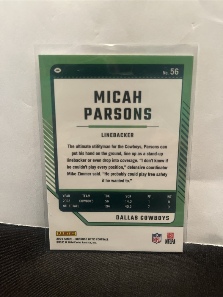 The product is a 2024 Panini Donruss Optic football trading card featuring Dallas Cowboys player Micah Parsons. This base set card is part of the National Football League (NFL) and is in near mint or better condition. With a card number of 56, this collectible item is a must-have for fans and collectors alike who want to add a piece of the 2024 season to their collection.