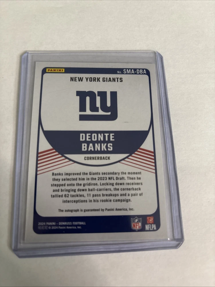This 2024 Donruss Football Trading Card features a signature label or sticker from Deonte Banks, a player for the New York Giants. The card is made of 20 pt. card stock and is an original from the United States. It is a single card in the Signature Marks insert set, with the card number SMA-DBA. The card is authenticated by Panini Authentic and has a parallel/variety of signatures. It is a part of the base set and has a card name of DEONTE BANKS. This trading card is perfect for collectors who are fans of the National Football League (NFL) and sport cards.