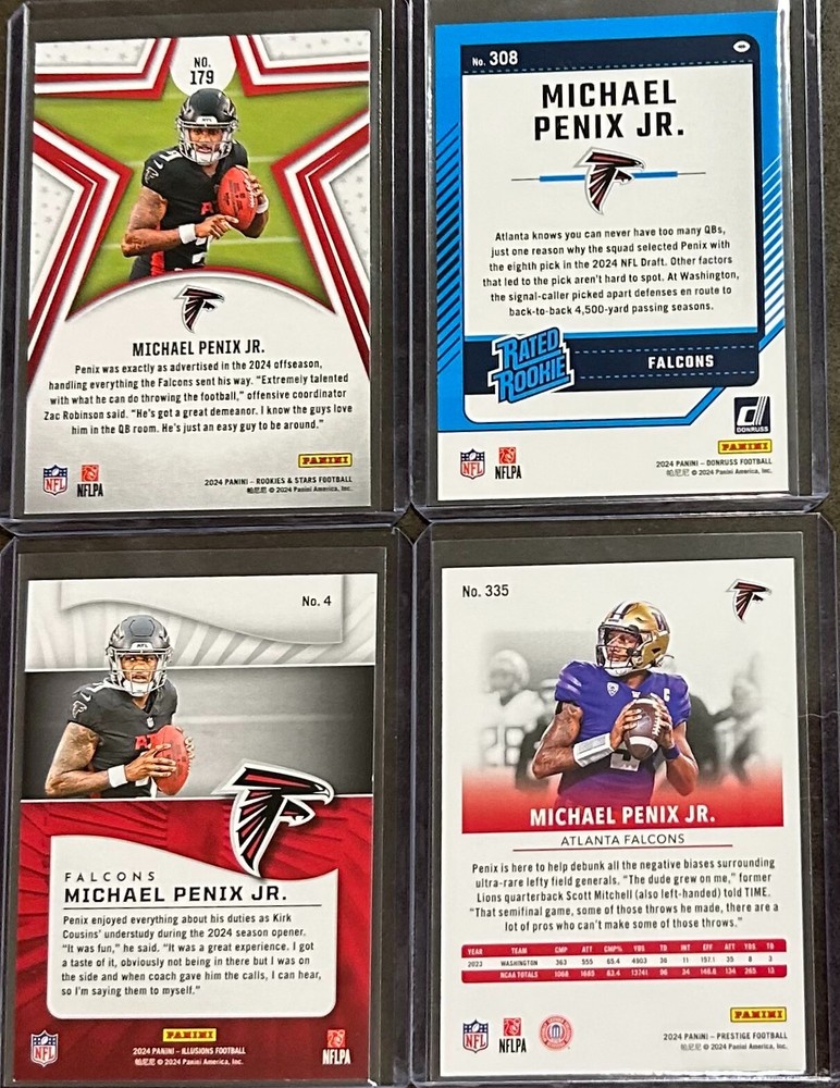 2024 Panini Football 4 card rookie base trading lot for Michael Penix Jr.! The cards are: 2024 Donruss Michael Penix Jr. #308 RC 2024 Illusions Michael Penix Jr. #4 RC 2024 Rookies and Stars Michael Penix Jr. #179 RC 2024 Prestige Michael Penix Jr. #335 RC