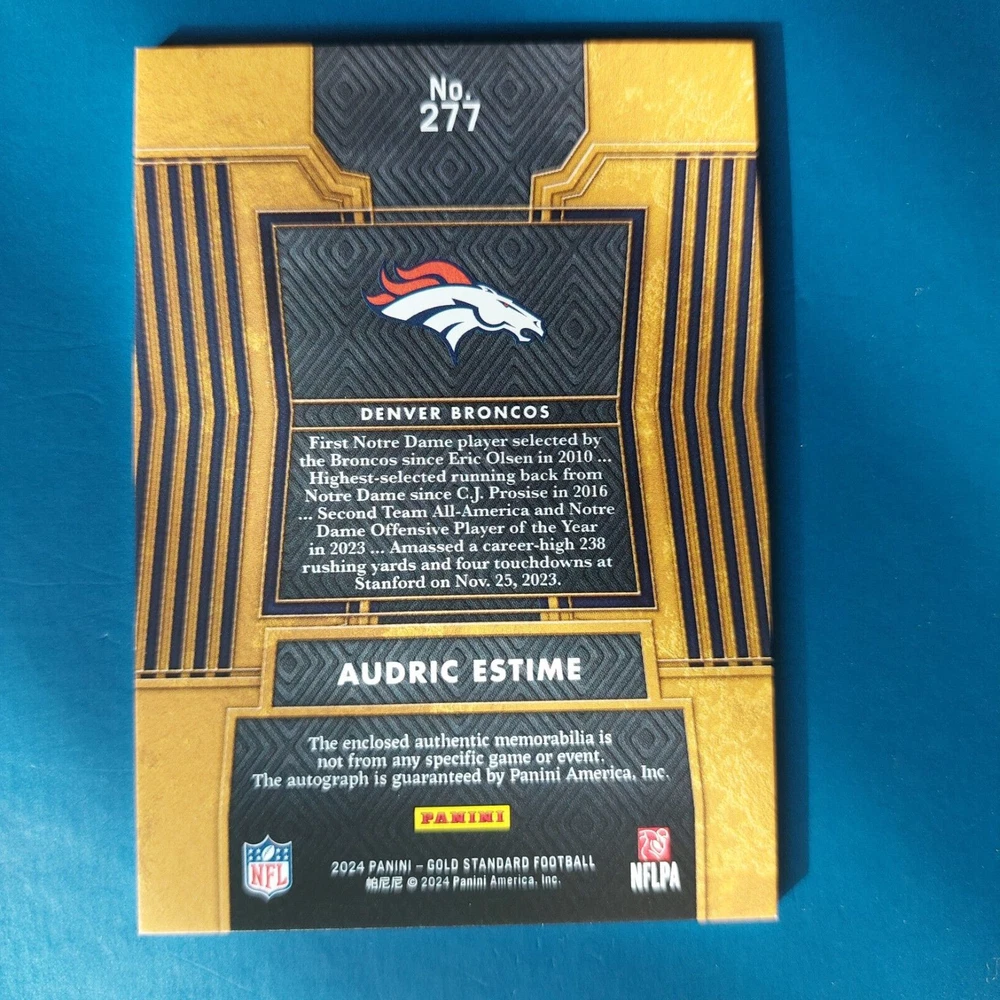 2024 Panini Gold Standard #277 Audric Estime JSY Auto #49/149 Check the scan/s. Please ask any questions at 24 hours before close of auction. C heck my store as well as my other quality auctions and listings for rookies, autographs, vintage, etc. Got a favorite player, team, or college? Search our inventory and save! If you make multiple purchases at the same time any additional cards will be shipped free with the first purchase for the highest shipping price charged with domestic shipping. The item is sent well protected in a bubble envelope with the USPS Ground Advantage which includes tracking. Any item that qualifies for the Authenticity Guarantee program is not available for local pickup or combined shipping. Please wait to be invoiced with multiple purchases. W e use the Ebay International Shipping program for foreign purchases through Ebay. Once any auction is complete foreign purchasers will be invoiced directly by The Ebay system for all applicable charges. Cards usually ship within 24 hours of payment.