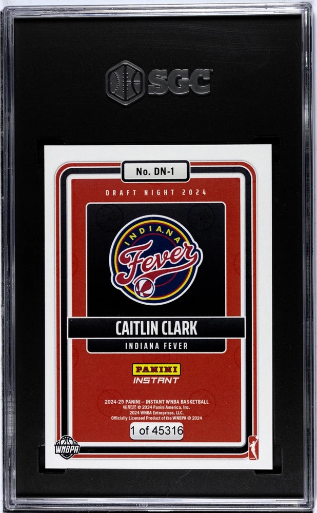 Indulge in the world of sports card collecting with this spectacular '2024 Panini Instant DN-1 Caitlin Clark Draft Night Rookie 1 SGC 9 Mint Indiana Fever' card. This gem is a must-have addition to any serious collection. From the renowned card brand 'Instant', this card showcases a stunning high-resolution image of the phenomenal athlete, Caitlin Clark, on her Draft Night. The card is graded as SGC 9 Mint, which speaks volumes about its impeccable condition and superior quality. The DN-1 card number is a testament to its authenticity and exclusivity. This card truly encapsulates the essence of Clark's pivotal moment with the Indiana Fever, making it a precious keepsake for fans and collectors alike. The glossy finish, sharp corners, and vibrant colors contribute to its visual appeal while the heavyweight cardstock ensures longevity. It's not just a sports card, it's a piece of sports history that encapsulates a memorable moment from Caitlin Clark's career. Whether you're a seasoned collector, a passionate Indiana Fever fan, or just starting your sports card journey, this Caitlin Clark Draft Night Rookie card is a treasure you'll want to own. It's more than just a card - it's a tangible piece of basketball heritage that you can hold, showcase, and admire. Secure this incredible find today and make a worthy addition to your sports card collection.