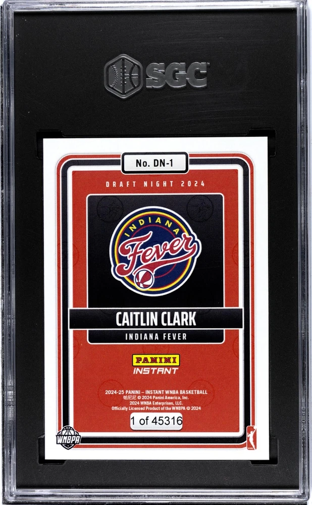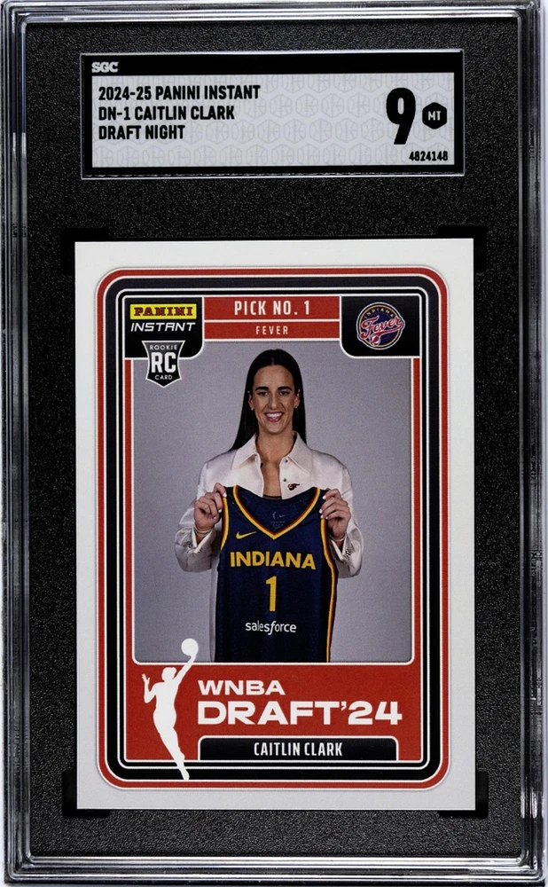 Unearth the exquisite beauty of the 2024 Panini Instant #DN-1 Caitlin Clark Rookie 1 SGC 9. This card is a mesmerizing gem that sports enthusiasts and collectors alike would surely covet. The brand 'Instant' verifies its authenticity and assures you of its high-grade quality. The card boasts the 'DN-1' number, a notable feature that sets it apart and adds to its unique appeal. The card's centerpiece, Caitlin Clark, is a sensational athlete whose rookie year performance is beautifully captured in this card, making it an absolute must-have. The card's condition has been meticulously evaluated and has received a remarkable SGC 9 rating, a testament to its near-pristine quality. This card's striking visuals combined with its significant athletic history make it an exceptional addition to any sports card collection. Whether you're an avid fan of Caitlin Clark, a seasoned collector of sports memorabilia, or a rookie enthusiast just beginning your collection, this card is a fantastic acquisition. Experience the thrill of owning a piece of sports history with the 2024 Panini Instant #DN-1 Caitlin Clark Rookie 1 SGC 9 card. Its value extends beyond mere aesthetics; it's an embodiment of sportsmanship and athletic excellence. Don't miss out on the opportunity to own this remarkable piece of memorabilia.