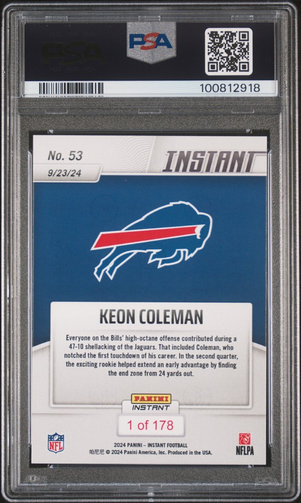 2024 Panini Instant Keon Coleman 53 1st touchdown PSA 10 Print run of 178 POP 12 I Have all Gem Mint 10's -1 Sold